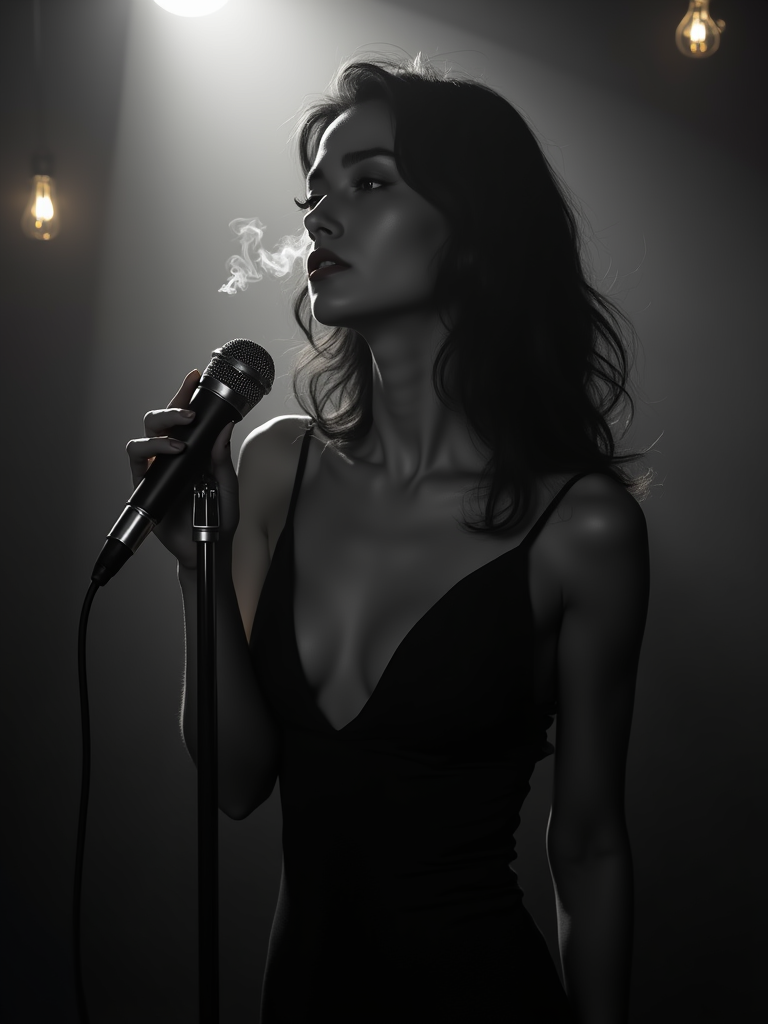 model as a mysterious femme fatale in a smoky jazz club, wearing a figure-hugging black dress with dramatic neckline , moody lighting, cigarette smoke creating atmospheric haze, vintage microphone nearby, black and white film noir aesthetic