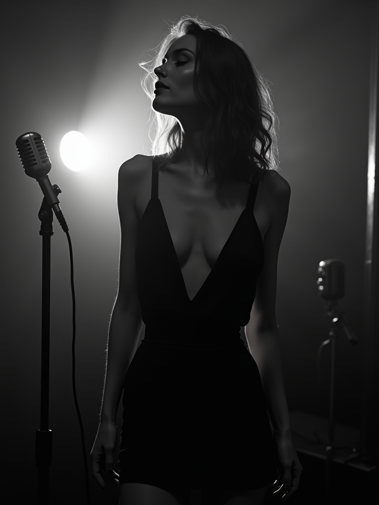 model as a mysterious femme fatale in a smoky jazz club, wearing a figure-hugging black dress with dramatic neckline , moody lighting, cigarette smoke creating atmospheric haze, vintage microphone nearby, black and white film noir aesthetic