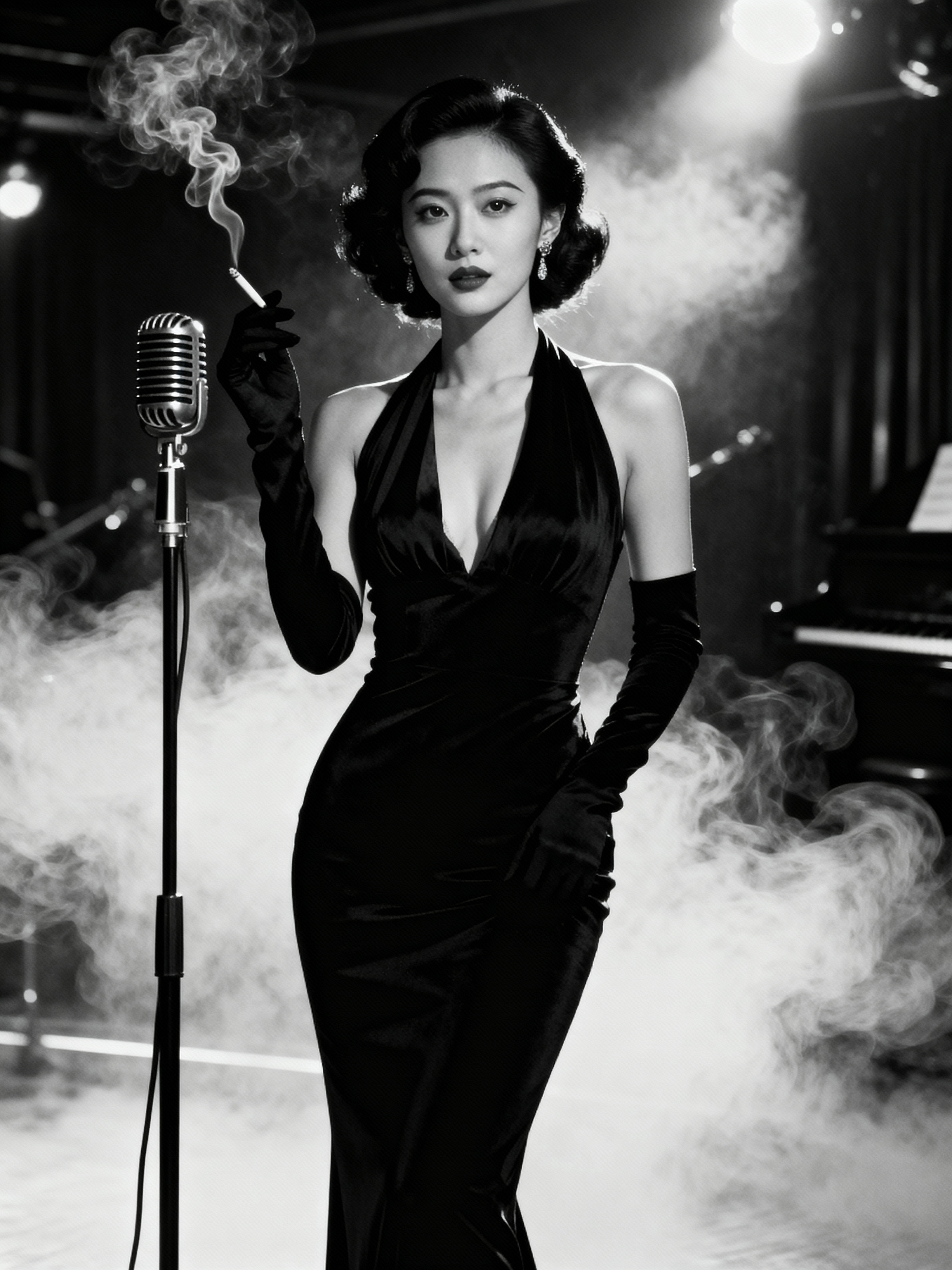 model as a mysterious femme fatale in a smoky jazz club, wearing a figure-hugging black dress with dramatic neckline , moody lighting, cigarette smoke creating atmospheric haze, vintage microphone nearby, black and white film noir aesthetic