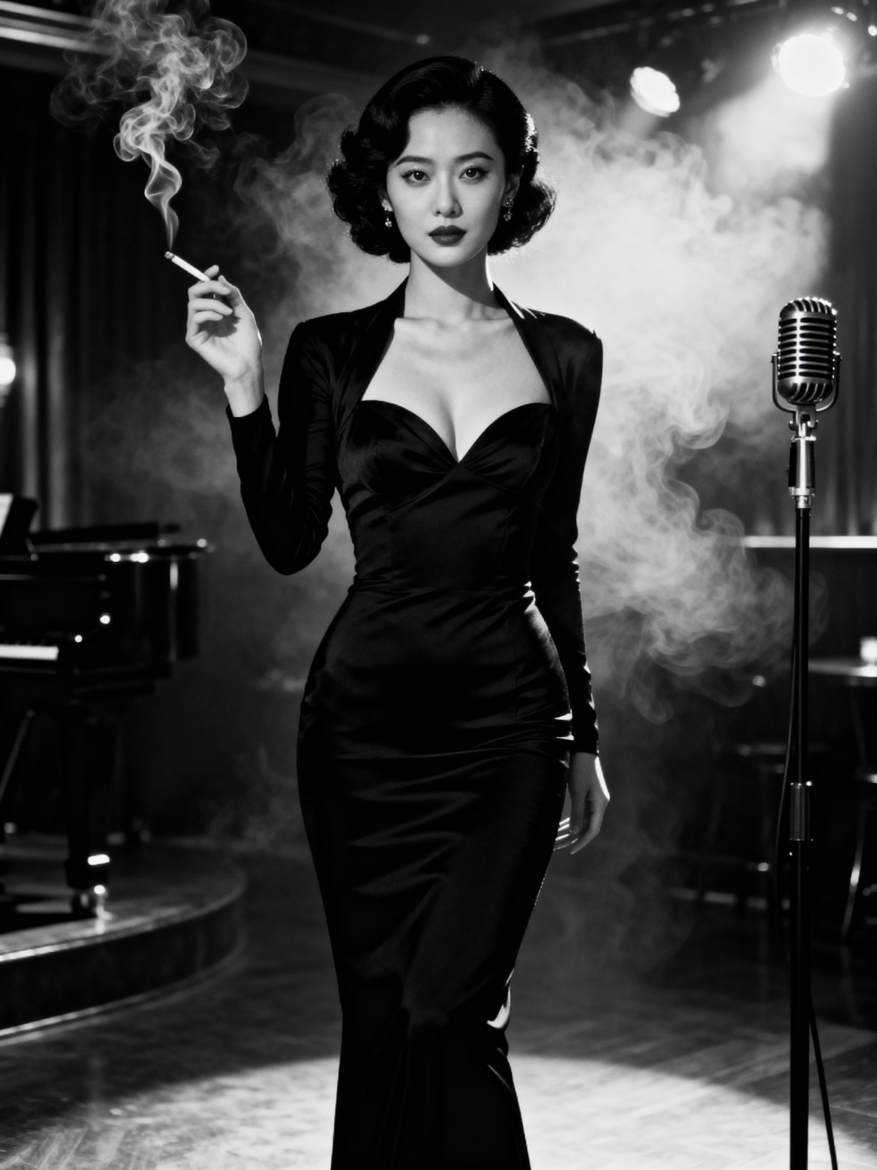 model as a mysterious femme fatale in a smoky jazz club, wearing a figure-hugging black dress with dramatic neckline , moody lighting, cigarette smoke creating atmospheric haze, vintage microphone nearby, black and white film noir aesthetic