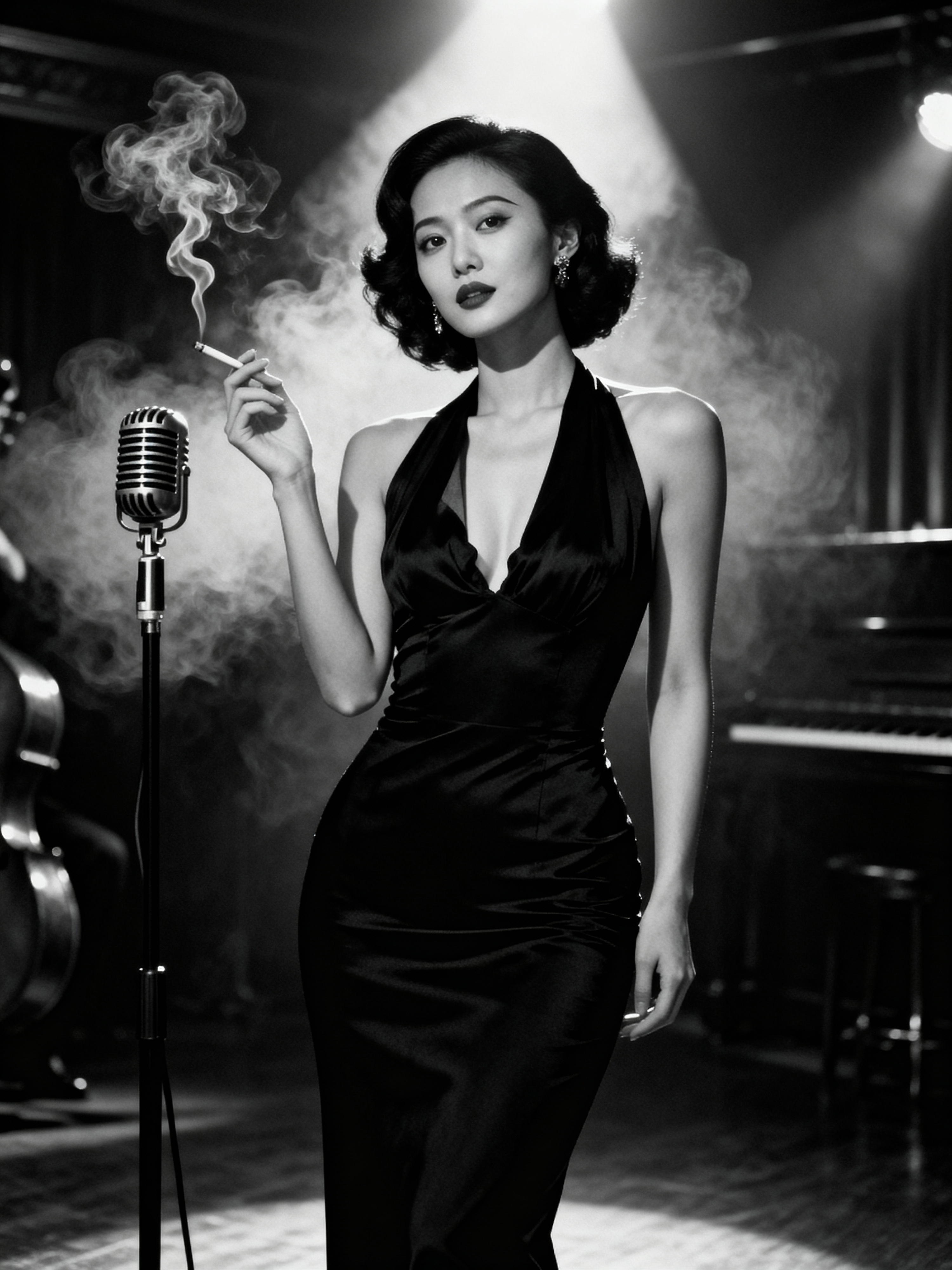model as a mysterious femme fatale in a smoky jazz club, wearing a figure-hugging black dress with dramatic neckline , moody lighting, cigarette smoke creating atmospheric haze, vintage microphone nearby, black and white film noir aesthetic