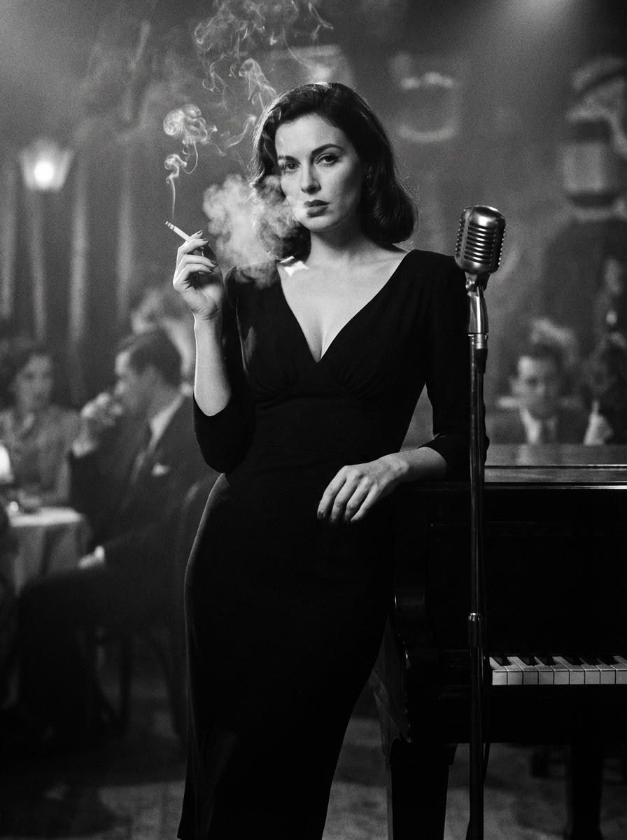 model as a mysterious femme fatale in a smoky jazz club, wearing a figure-hugging black dress with dramatic neckline , moody lighting, cigarette smoke creating atmospheric haze, vintage microphone nearby, black and white film noir aesthetic