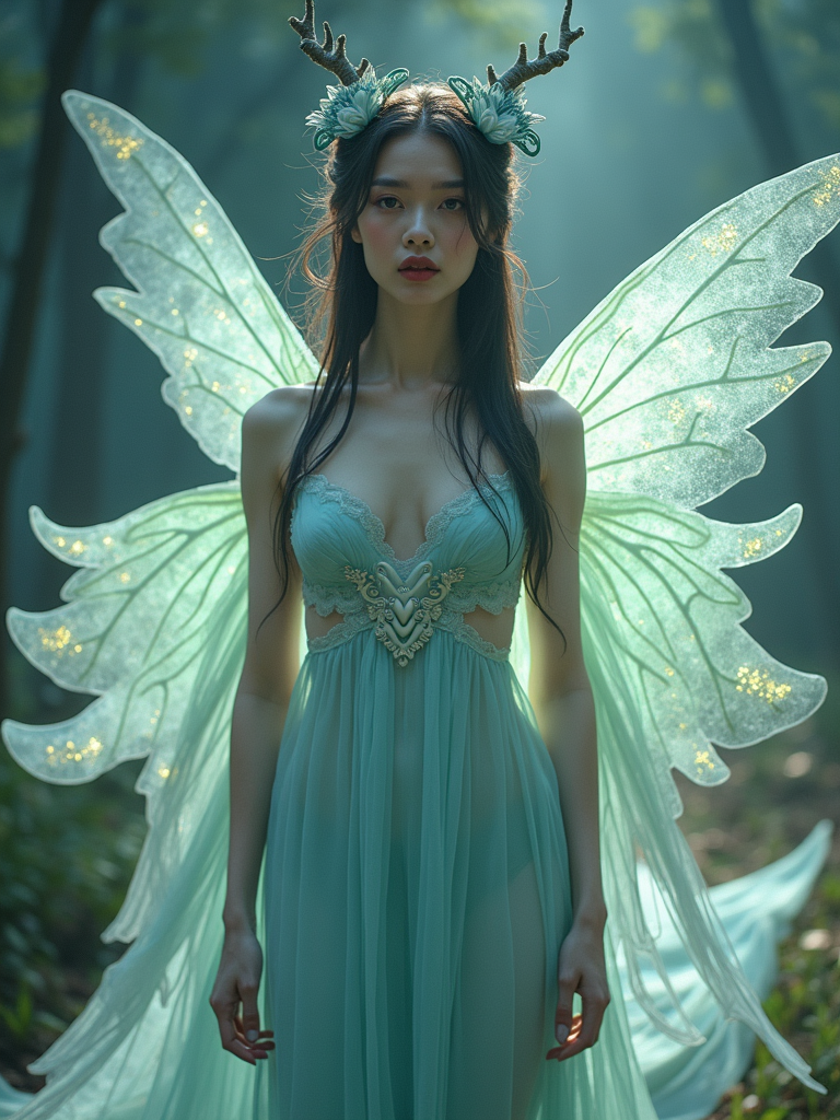 model as a mythical creature, outdoors in a mystical setting, wearing an ethereal fairy outfit with glowing wings , magical atmosphere