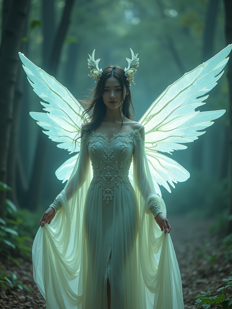 model as a mythical creature, outdoors in a mystical setting, wearing an ethereal fairy outfit with glowing wings , magical atmosphere