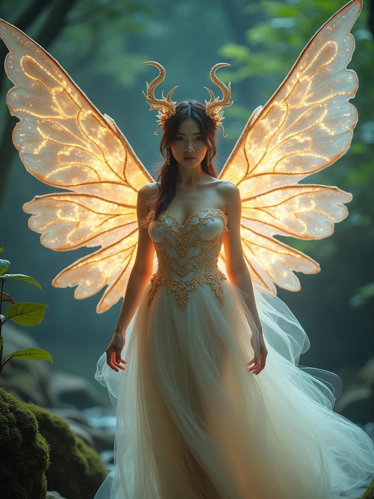 model as a mythical creature, outdoors in a mystical setting, wearing an ethereal fairy outfit with glowing wings , magical atmosphere