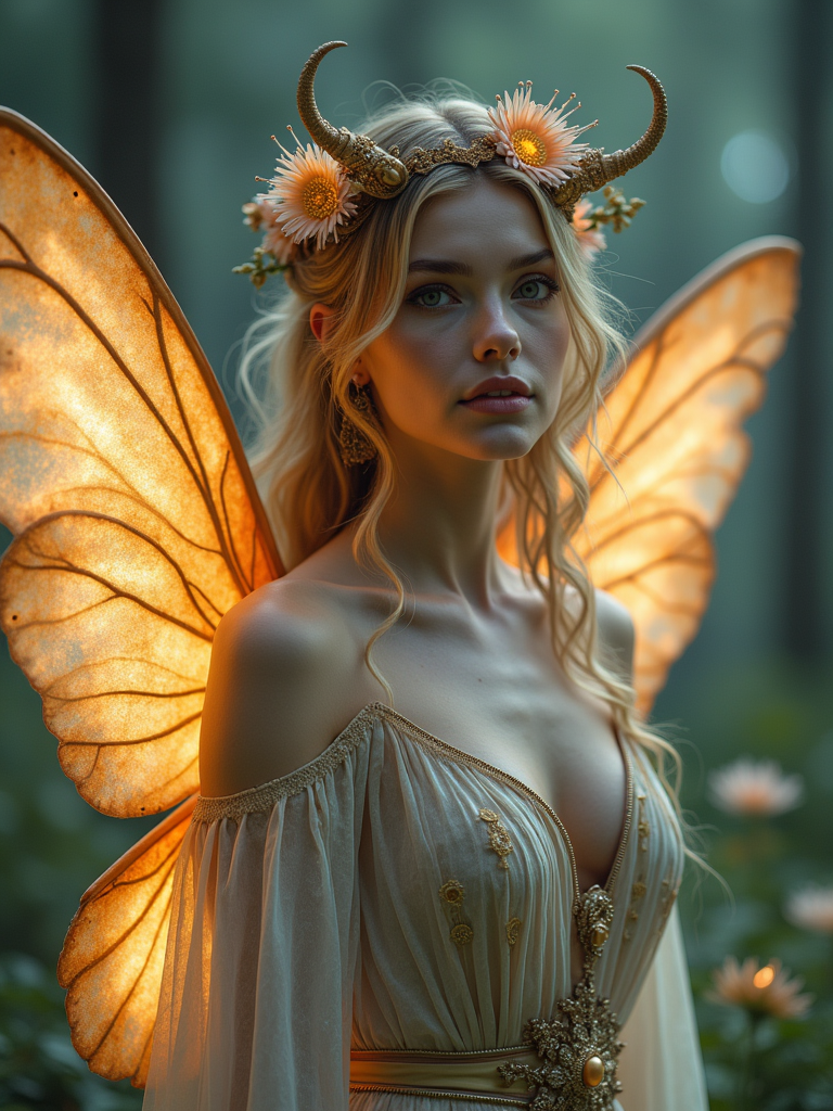 model as a mythical creature, outdoors in a mystical setting, wearing an ethereal fairy outfit with glowing wings , magical atmosphere