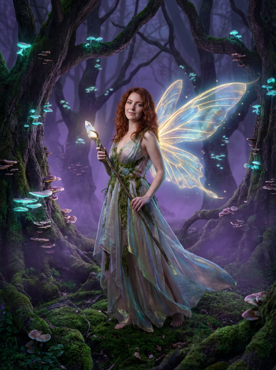 model as a mythical creature, outdoors in a mystical setting, wearing an ethereal fairy outfit with glowing wings , magical atmosphere