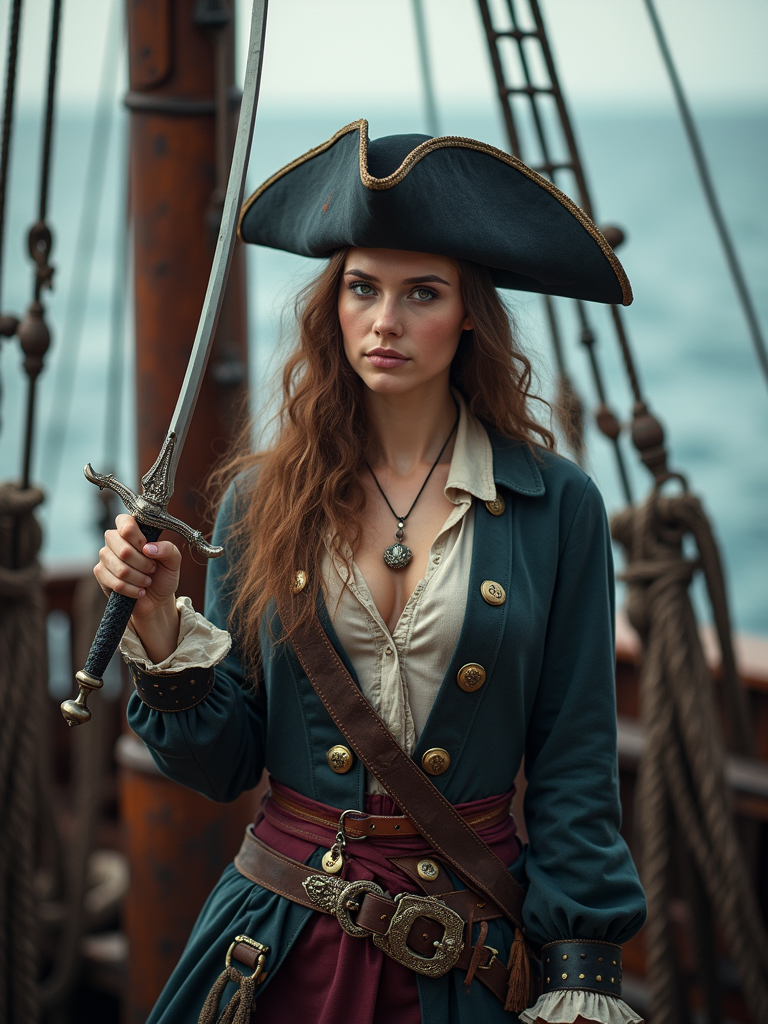 model as a pirate, on a ship deck set, wearing a daring pirate captain outfit with a tricorne hat and sword , dramatic ocean-themed props