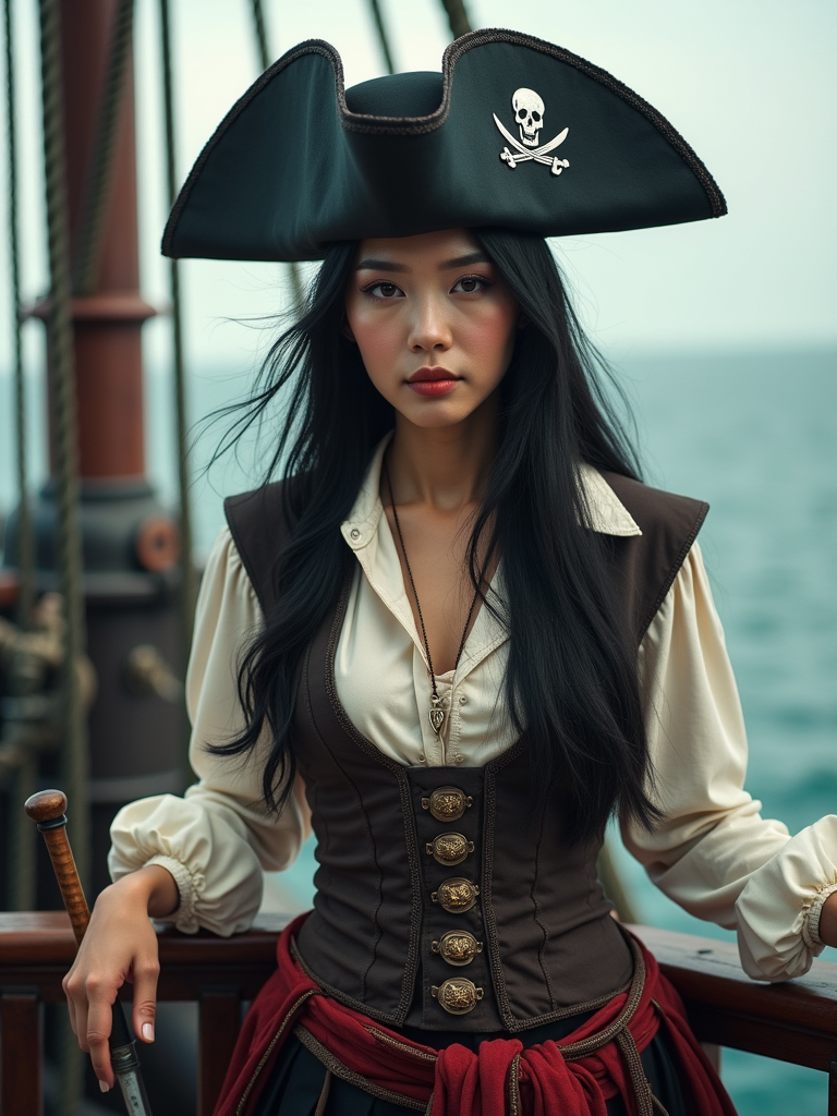 model as a pirate, on a ship deck set, wearing a daring pirate captain outfit with a tricorne hat and sword , dramatic ocean-themed props