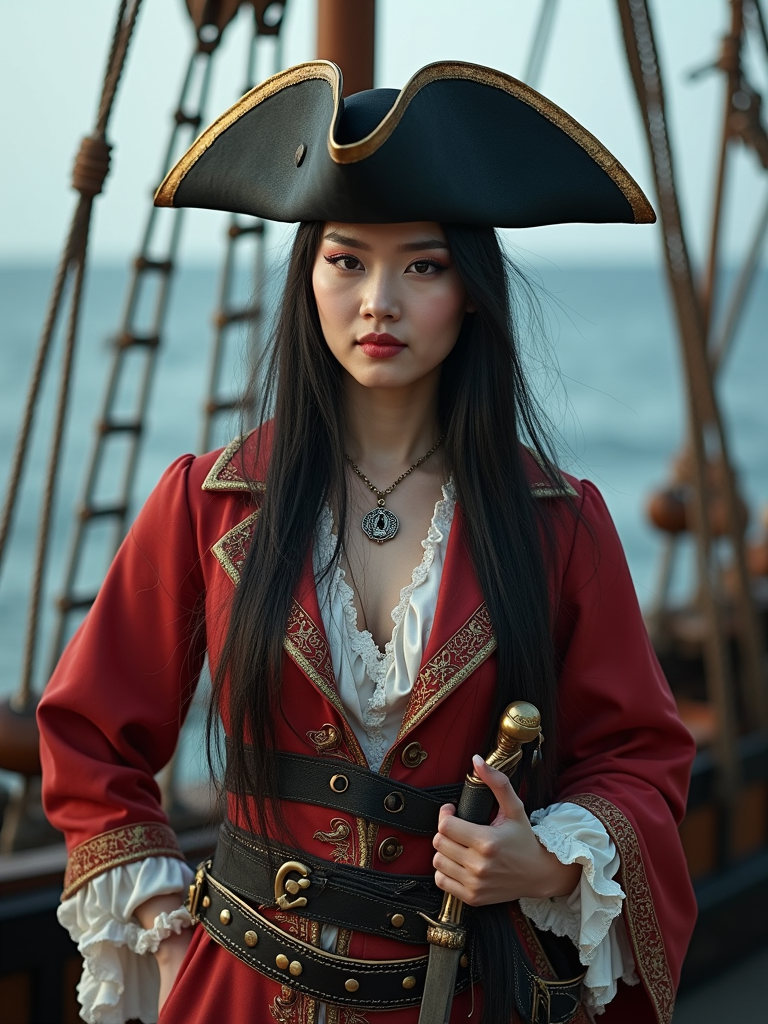 model as a pirate, on a ship deck set, wearing a daring pirate captain outfit with a tricorne hat and sword , dramatic ocean-themed props