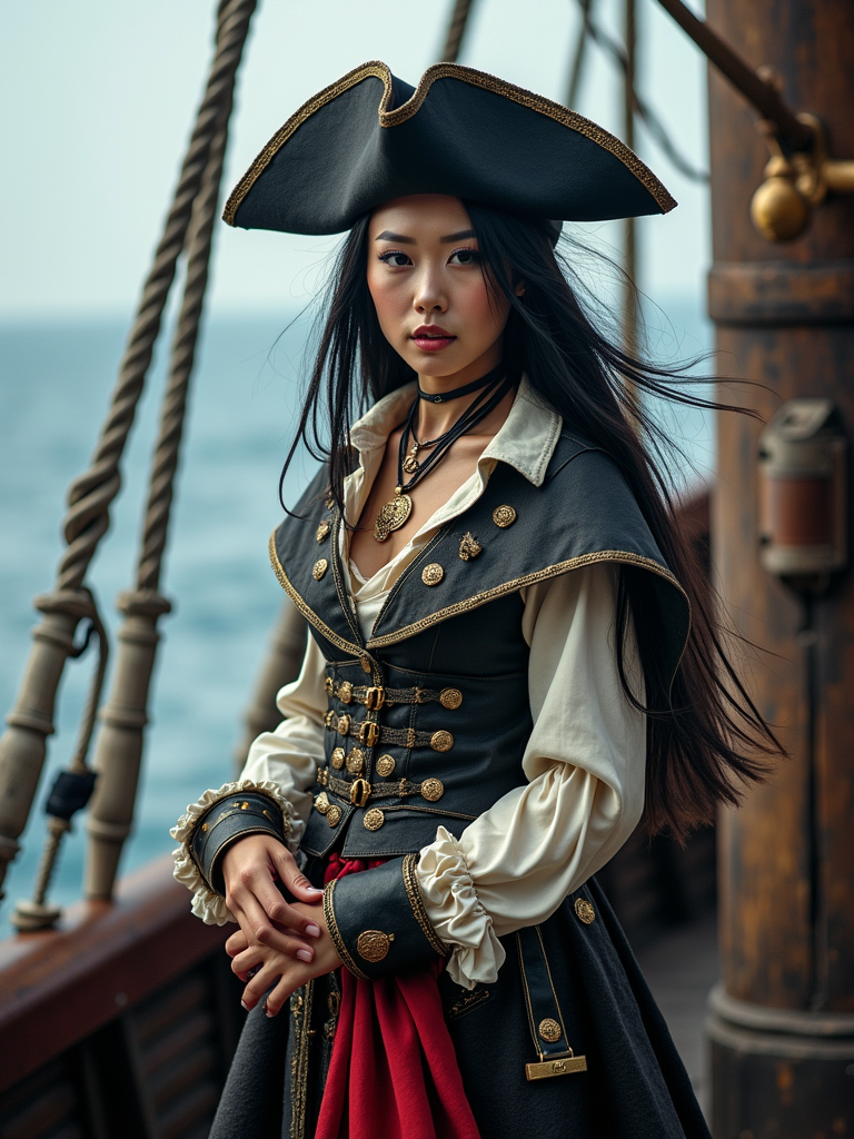 model as a pirate, on a ship deck set, wearing a daring pirate captain outfit with a tricorne hat and sword , dramatic ocean-themed props