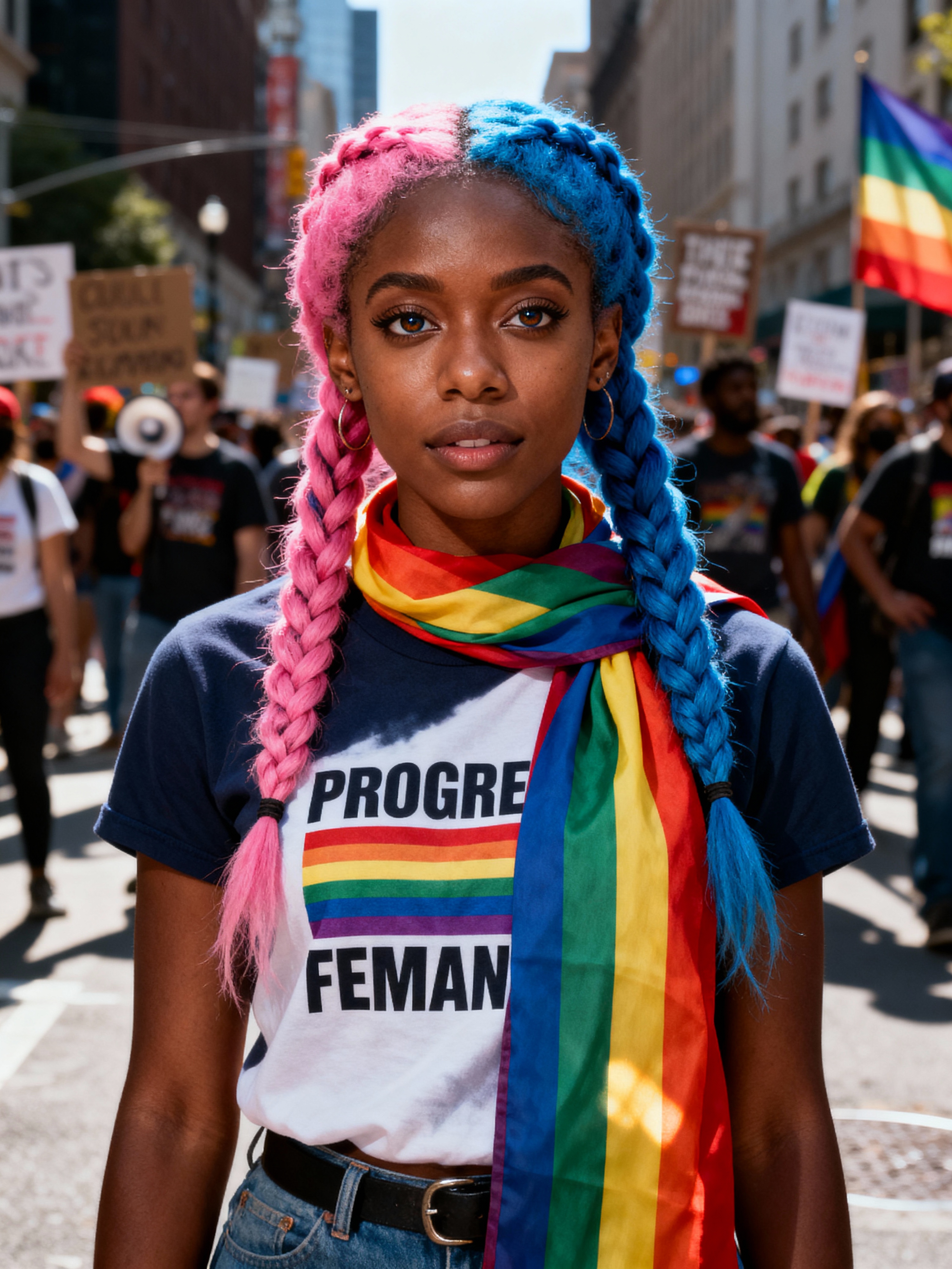 model as a progressive LGBTQ activist feminist with pink or blue hair