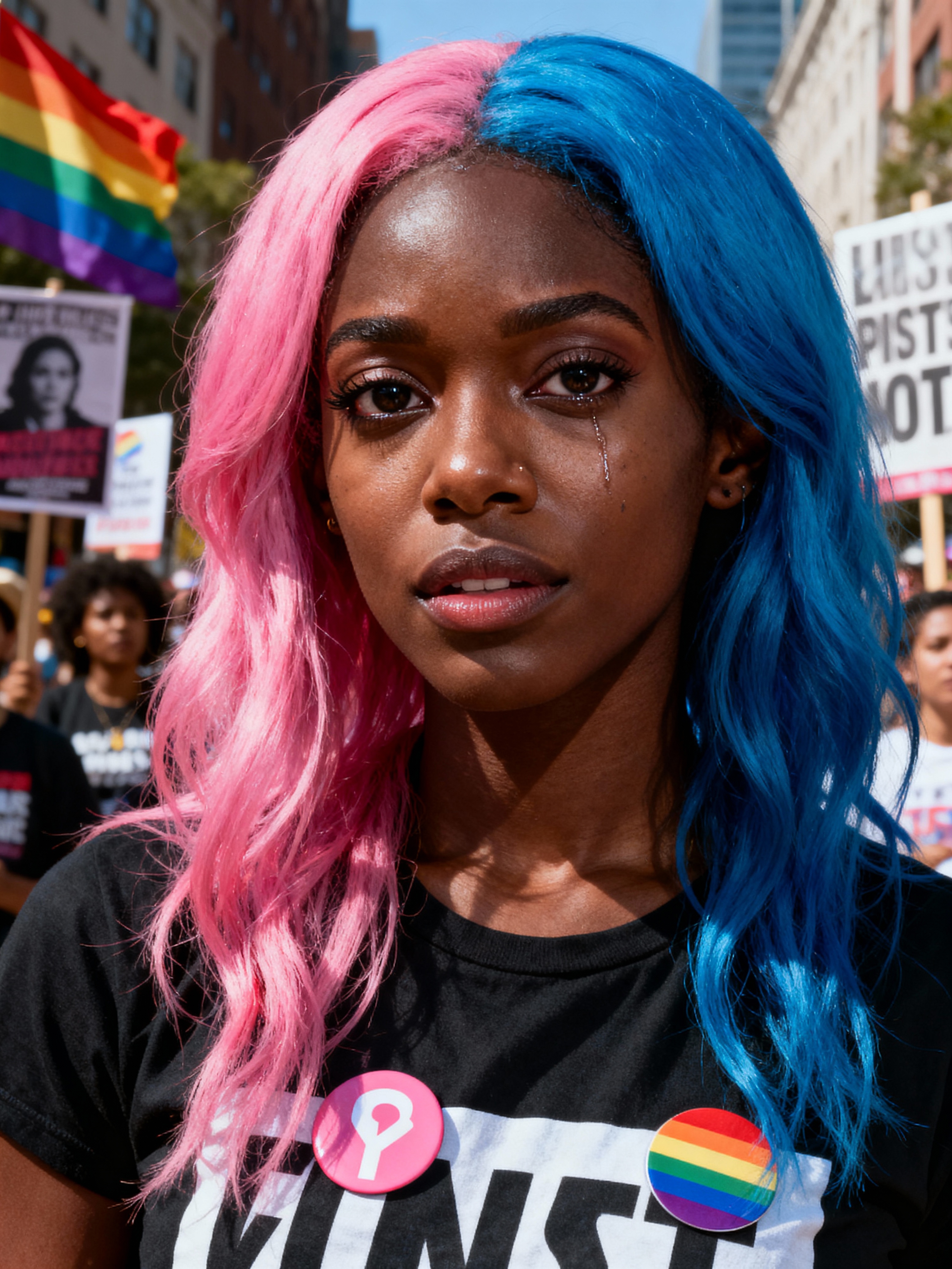 model as a progressive LGBTQ activist feminist with pink or blue hair