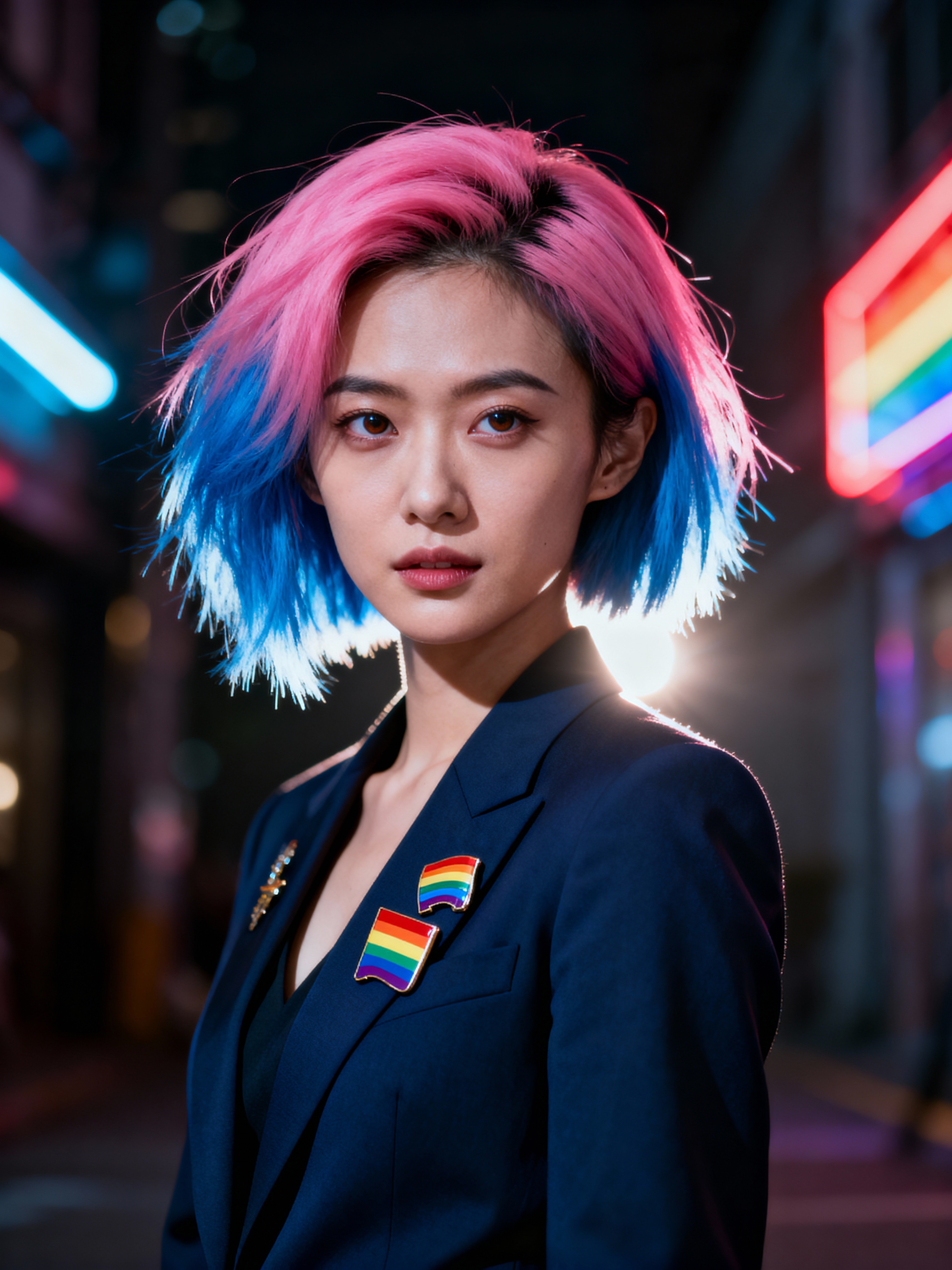 model as a progressive LGBTQ activist feminist with pink or blue hair