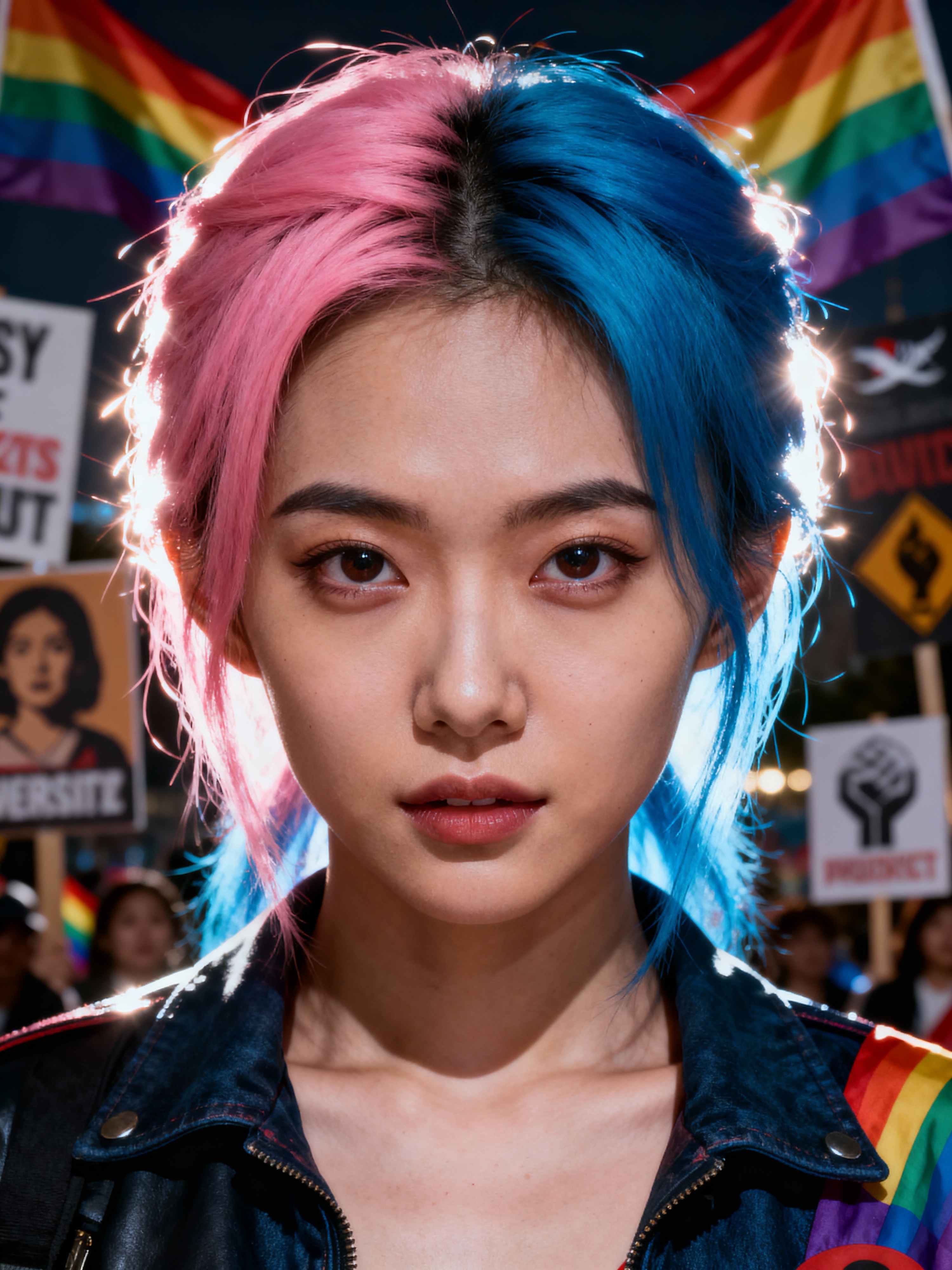 model as a progressive LGBTQ activist feminist with pink or blue hair