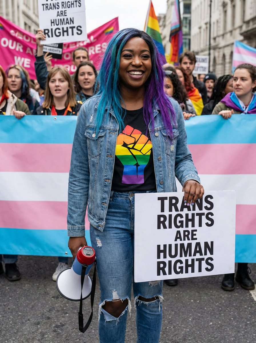 model as a progressive LGBTQ activist with pink or blue hair