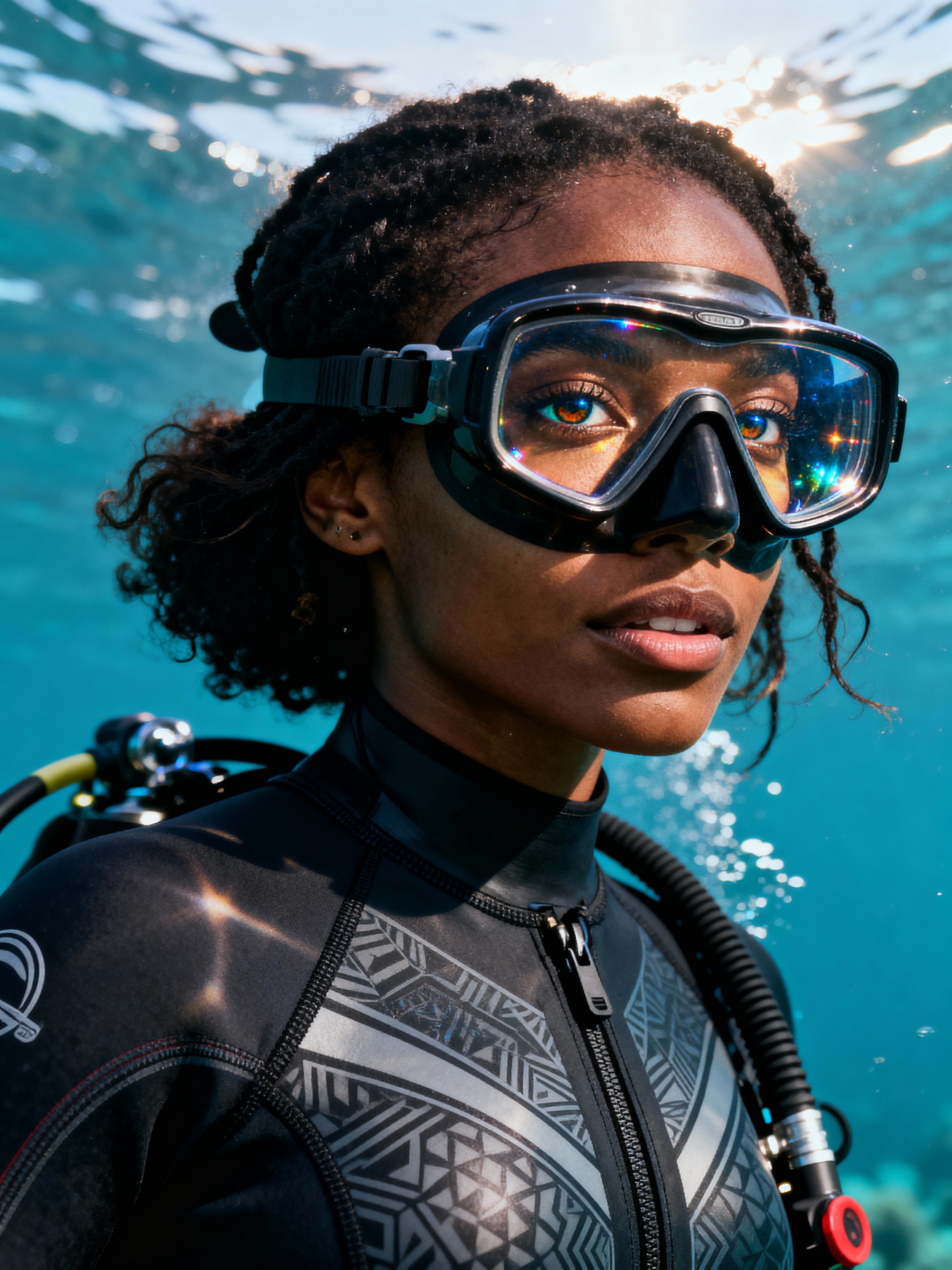 model as a scuba diver wearing diving goggles and wearing a wetsuit