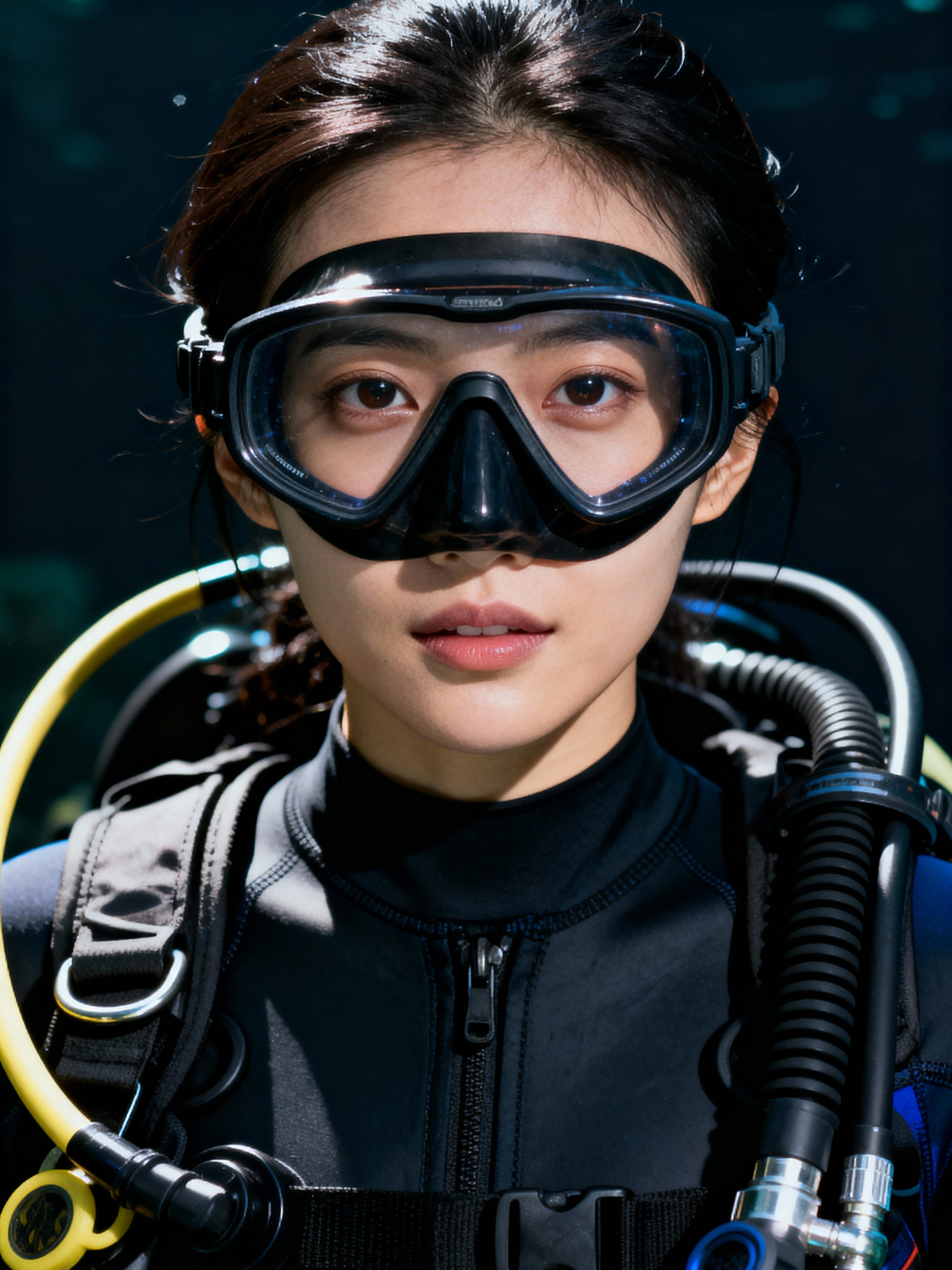 model as a scuba diver wearing diving goggles and wearing a wetsuit
