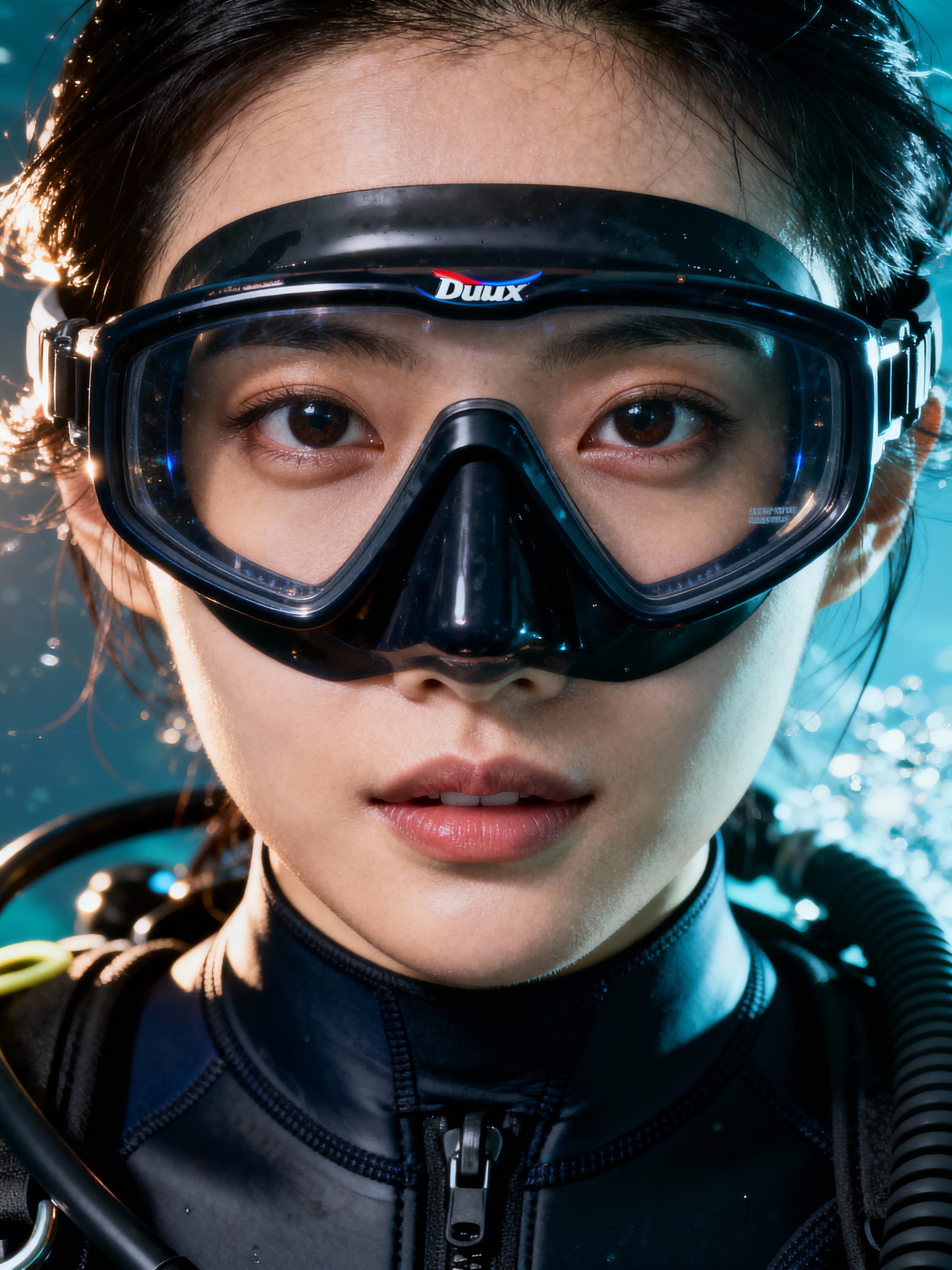 model as a scuba diver wearing diving goggles and wearing a wetsuit