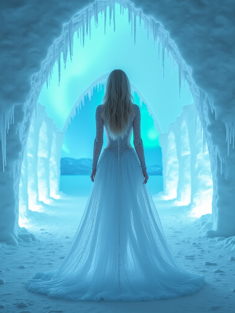 model as a snow queen in an ice crystal gown standing in a frozen fairy palace made of ice and snow with aurora borealis dancing in the background