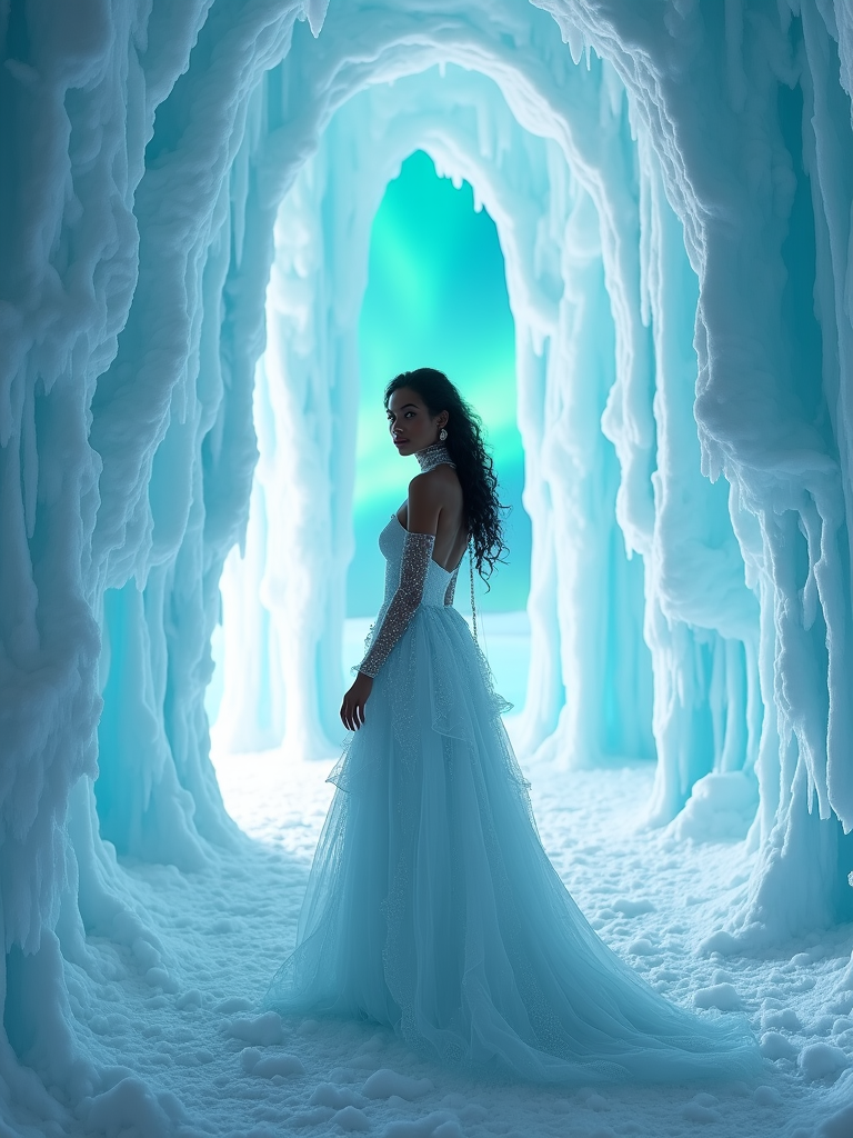 model as a snow queen in an ice crystal gown standing in a frozen fairy palace made of ice and snow with aurora borealis dancing in the background