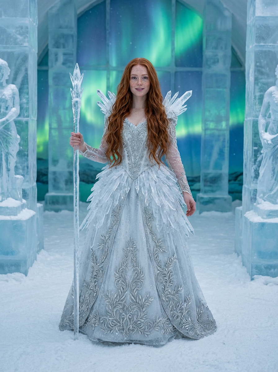 model as a snow queen in an ice crystal gown standing in a frozen fairy palace made of ice and snow with aurora borealis dancing in the background