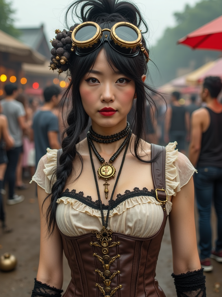 model as a steampunk adventurer, outdoors at a themed event, wearing a corset with goggles and lace gloves , surrounded by steampunk props and gears