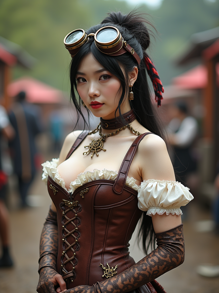 model as a steampunk adventurer, outdoors at a themed event, wearing a corset with goggles and lace gloves , surrounded by steampunk props and gears