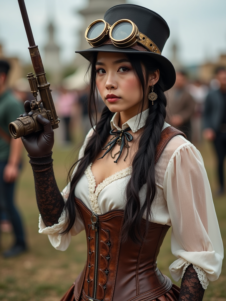 model as a steampunk adventurer, outdoors at a themed event, wearing a corset with goggles and lace gloves , surrounded by steampunk props and gears