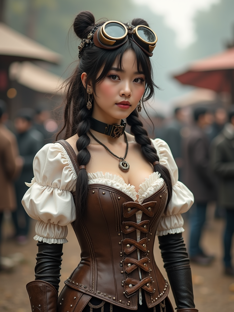 model as a steampunk adventurer, outdoors at a themed event, wearing a corset with goggles and lace gloves , surrounded by steampunk props and gears