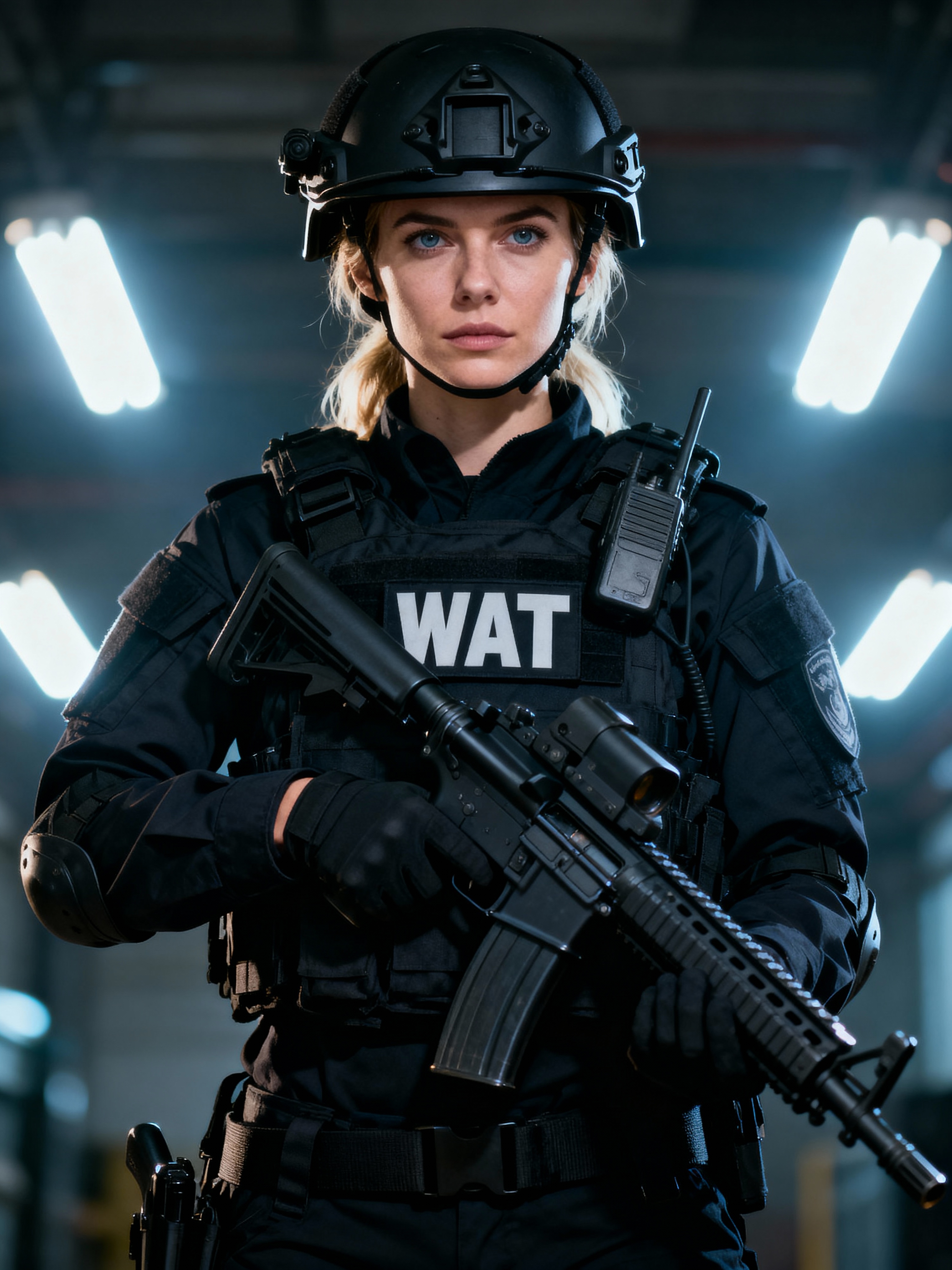 model as a SWAT Officer. wearing black swat vest, swat helmet, holding pdw