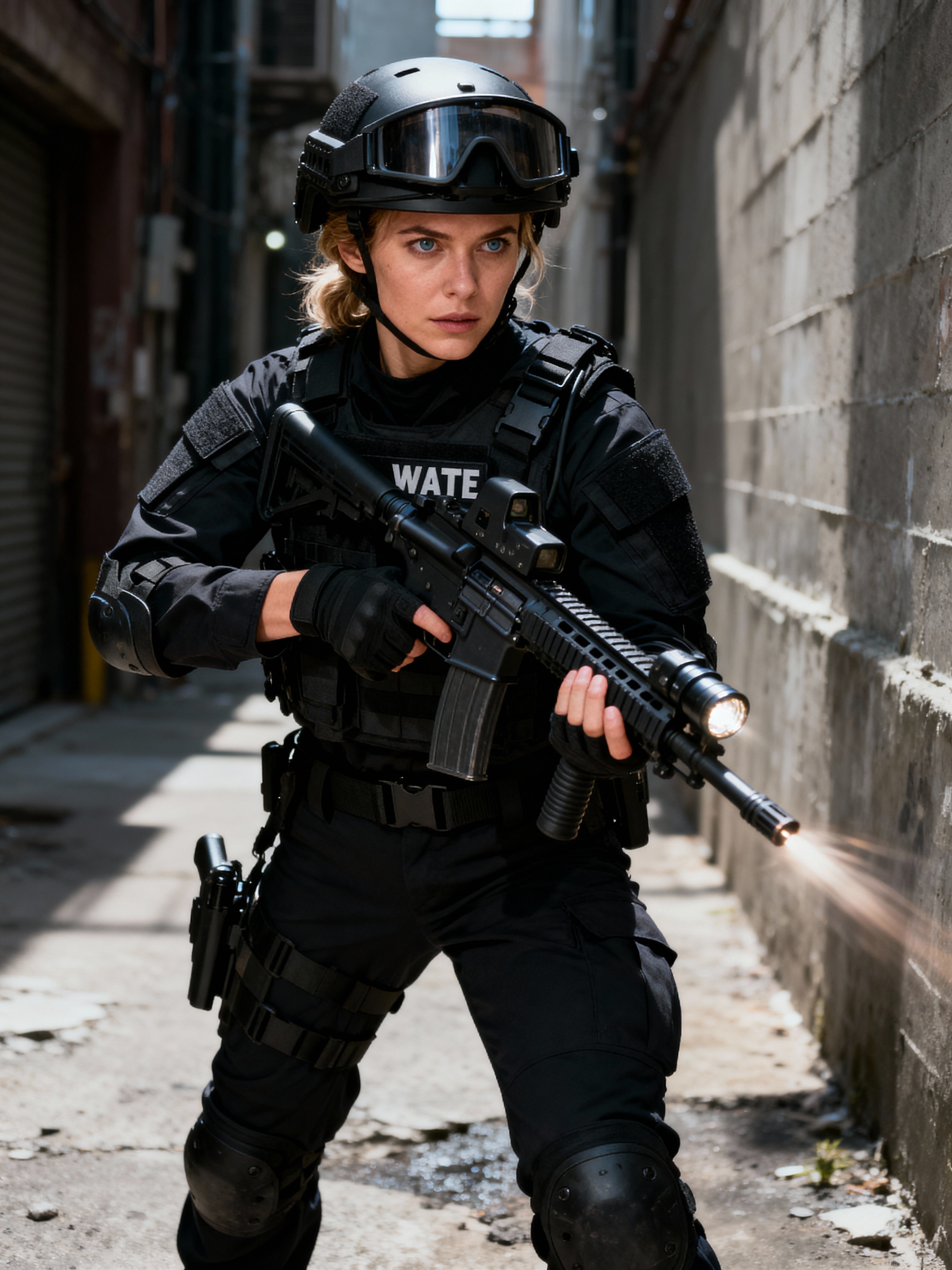 model as a SWAT Officer. wearing black swat vest, swat helmet, holding pdw
