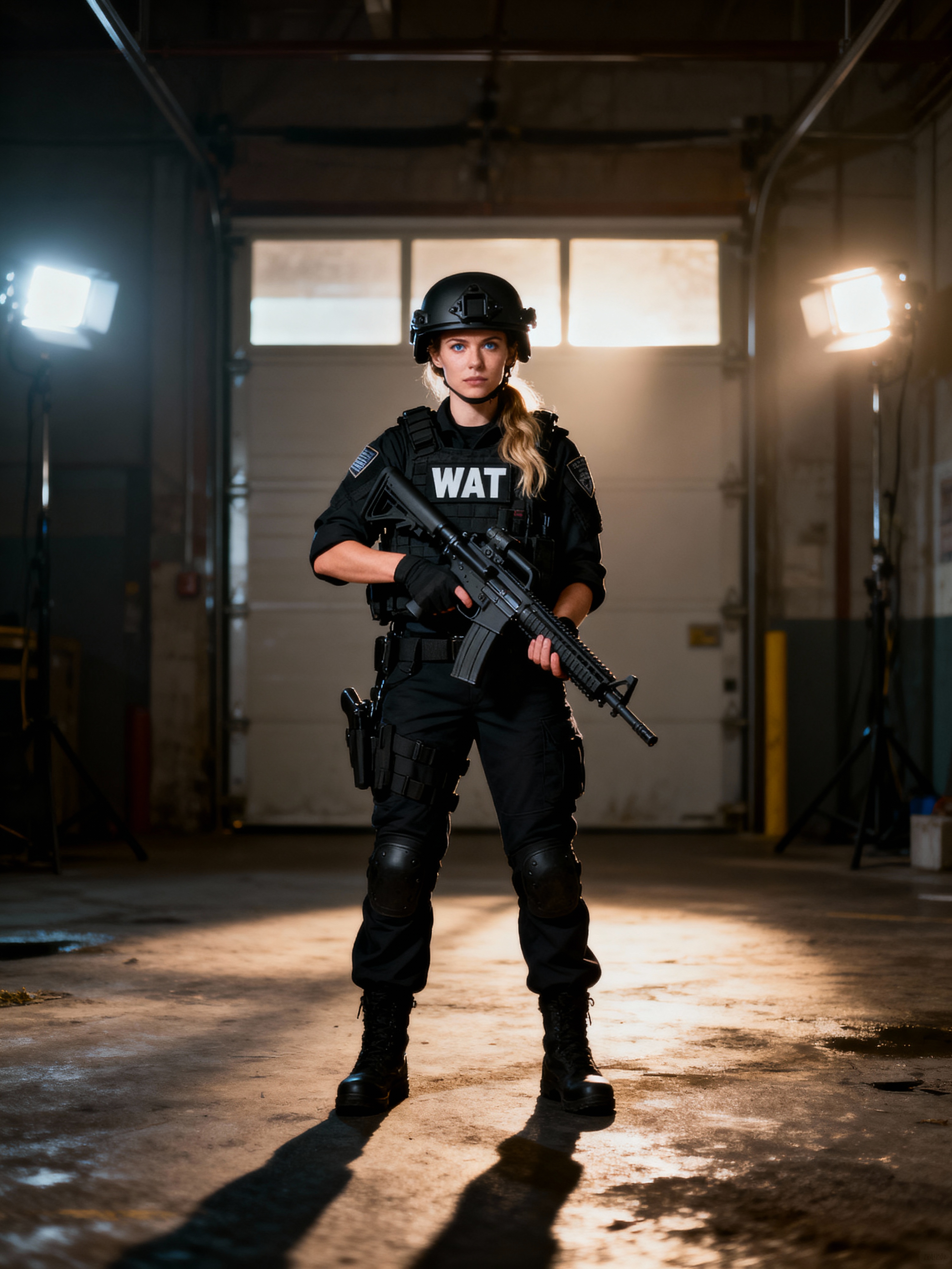 model as a SWAT Officer. wearing black swat vest, swat helmet, holding pdw