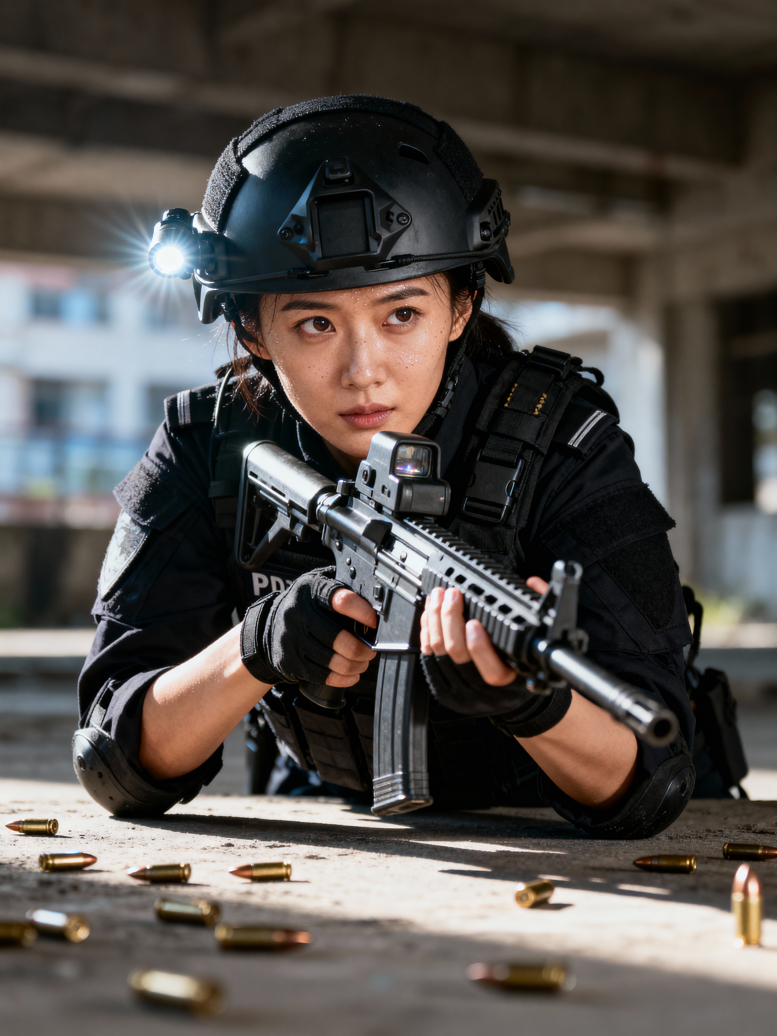 model as a SWAT Officer. wearing black swat vest, swat helmet, holding pdw