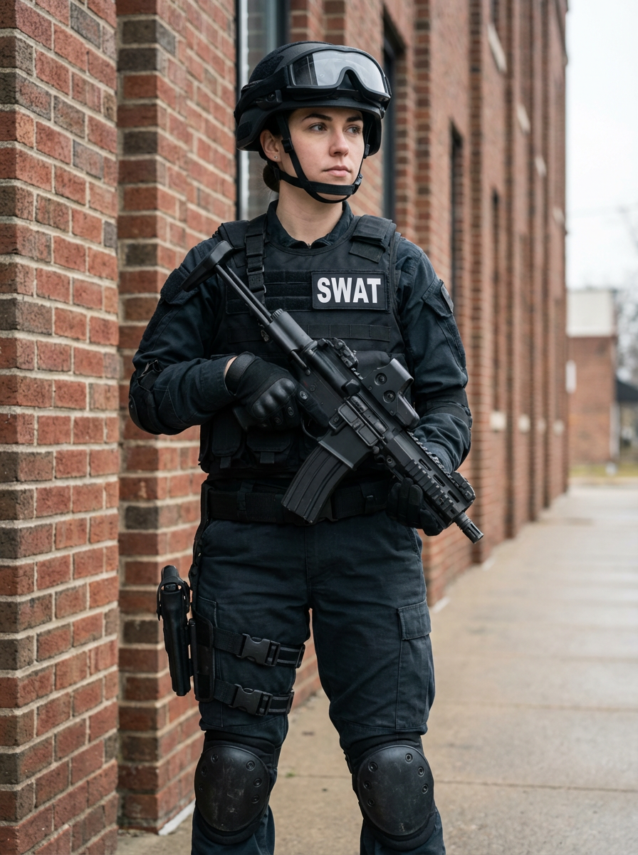 model as a SWAT Officer. wearing black swat vest, swat helmet, holding pdw