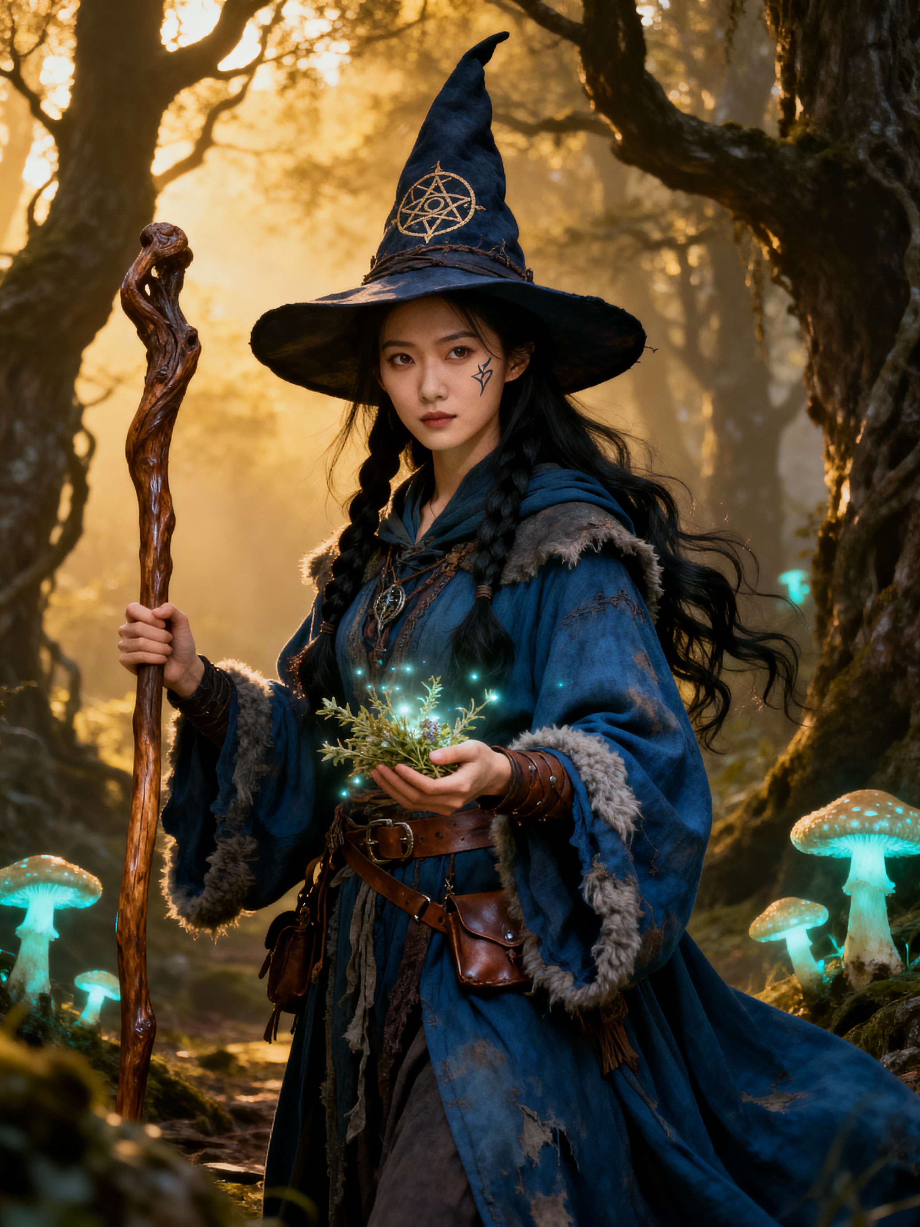 model as a Witch with a Alewife witch hat in the 14th century doing withcraft