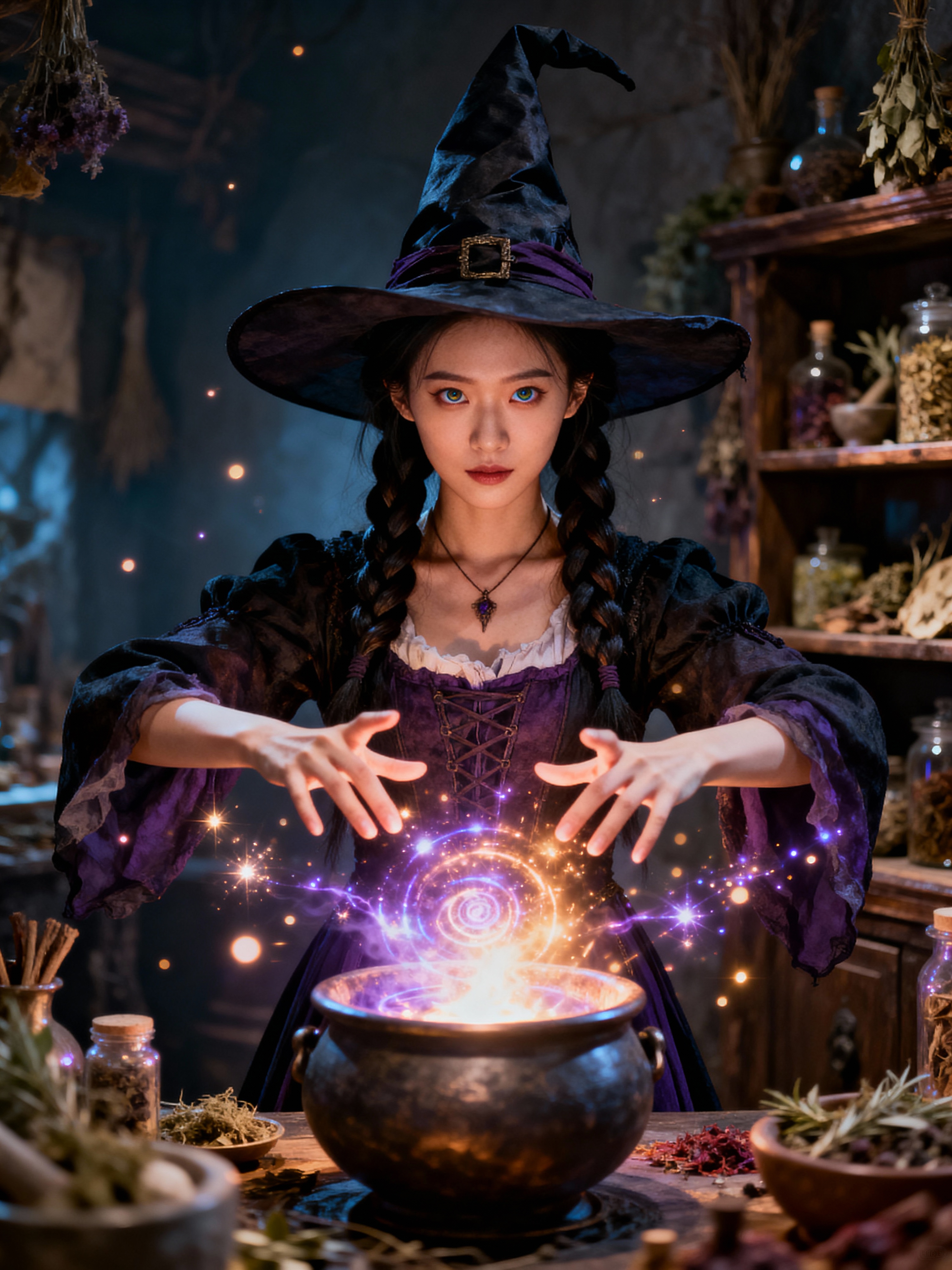 model as a Witch with a Alewife witch hat in the 14th century doing withcraft