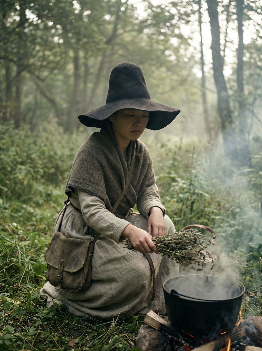 model as a Witch with a Alewife witch hat in the 14th century doing withcraft
