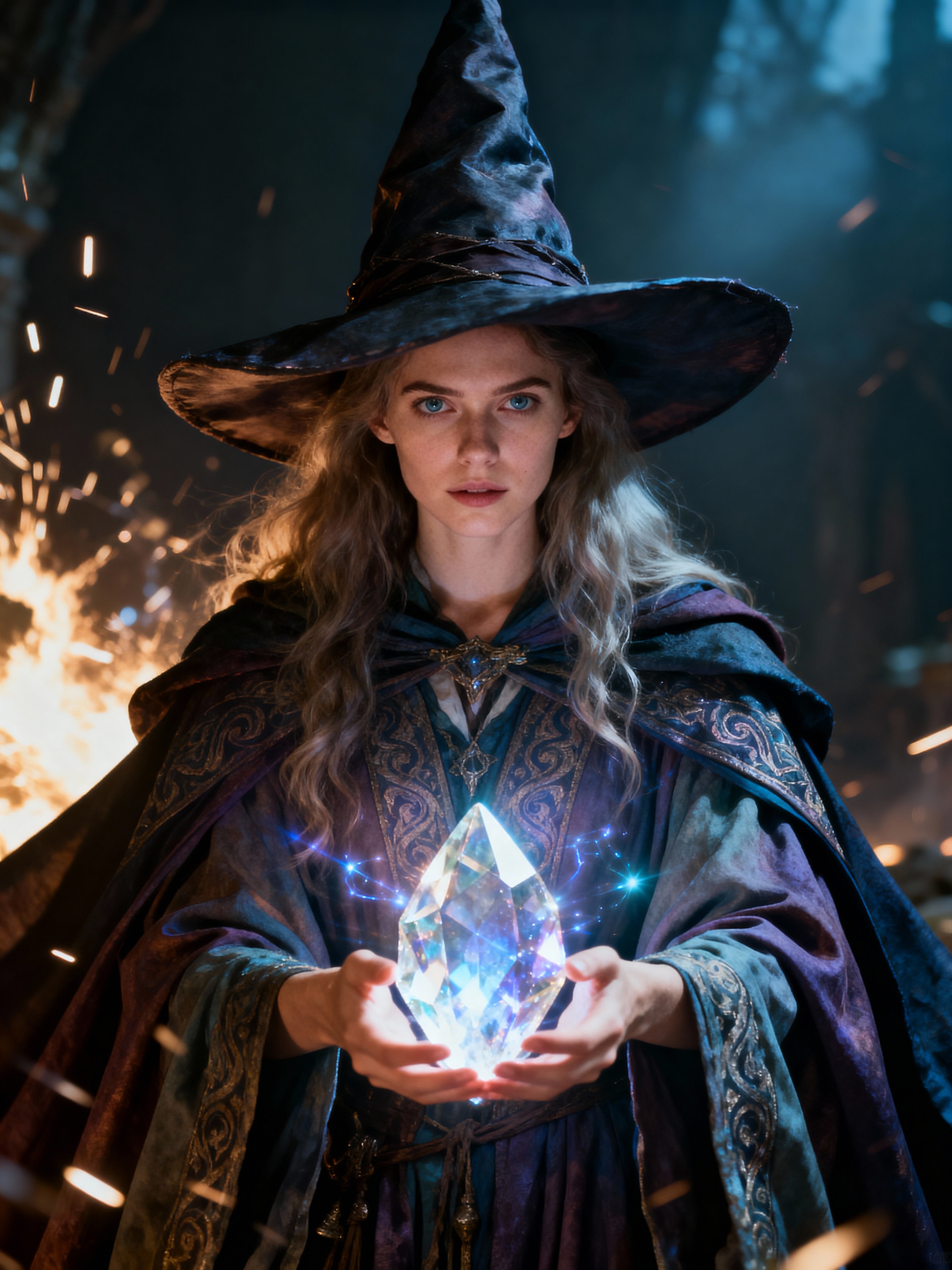 model as a Wizard with a Wizard robe and big hat, crystal magic, dramatic light