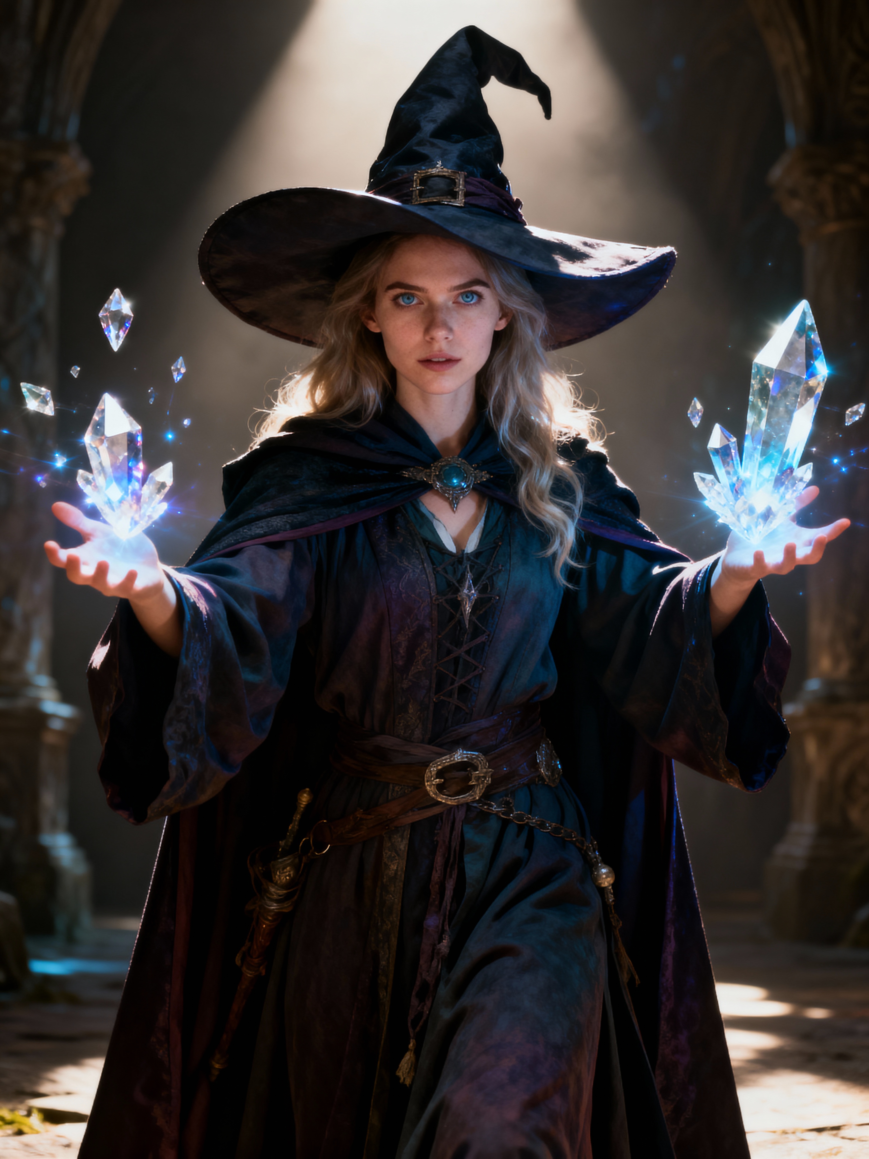 model as a Wizard with a Wizard robe and big hat, crystal magic, dramatic light