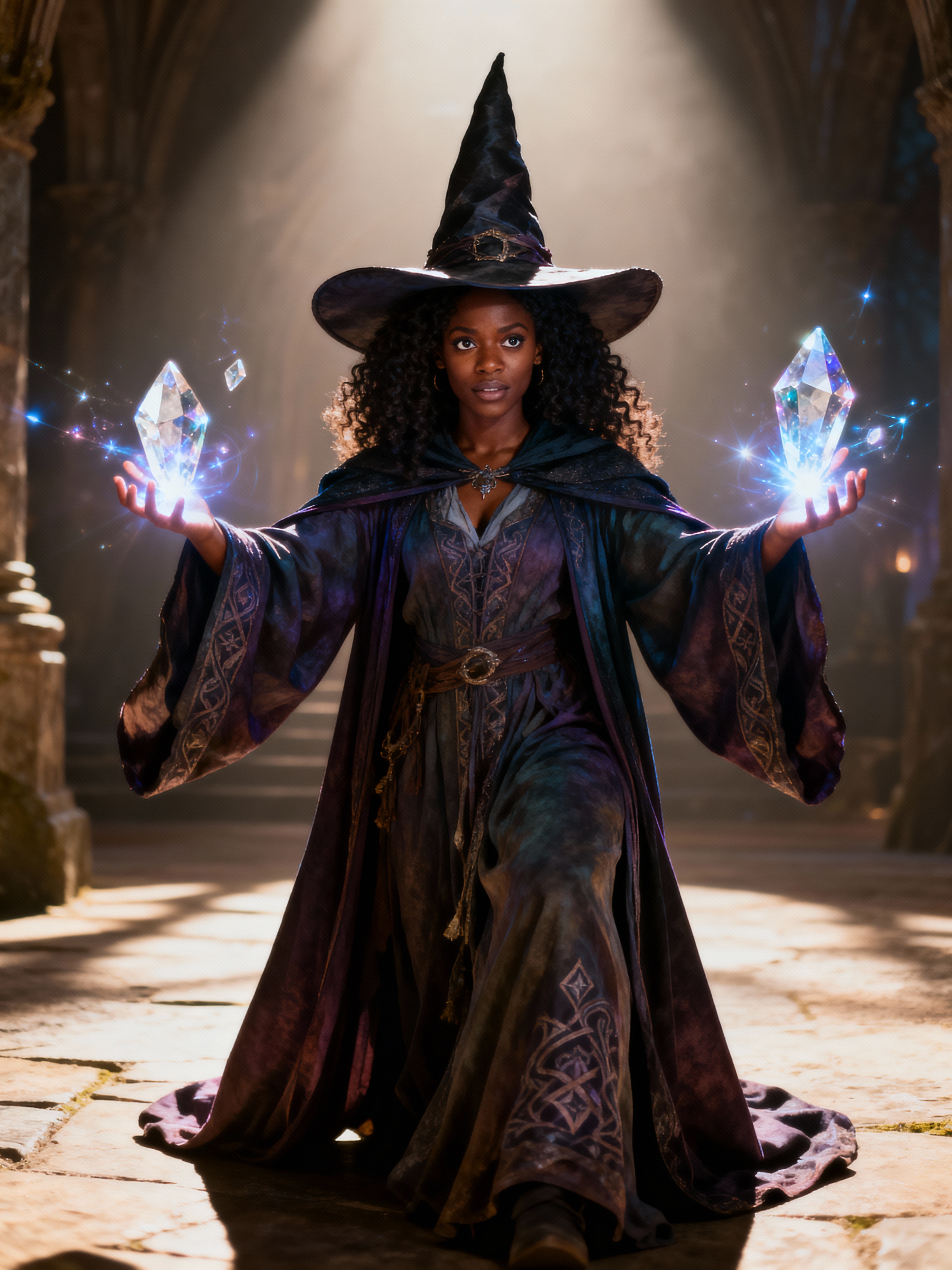 model as a Wizard with a Wizard robe and big hat, crystal magic, dramatic light