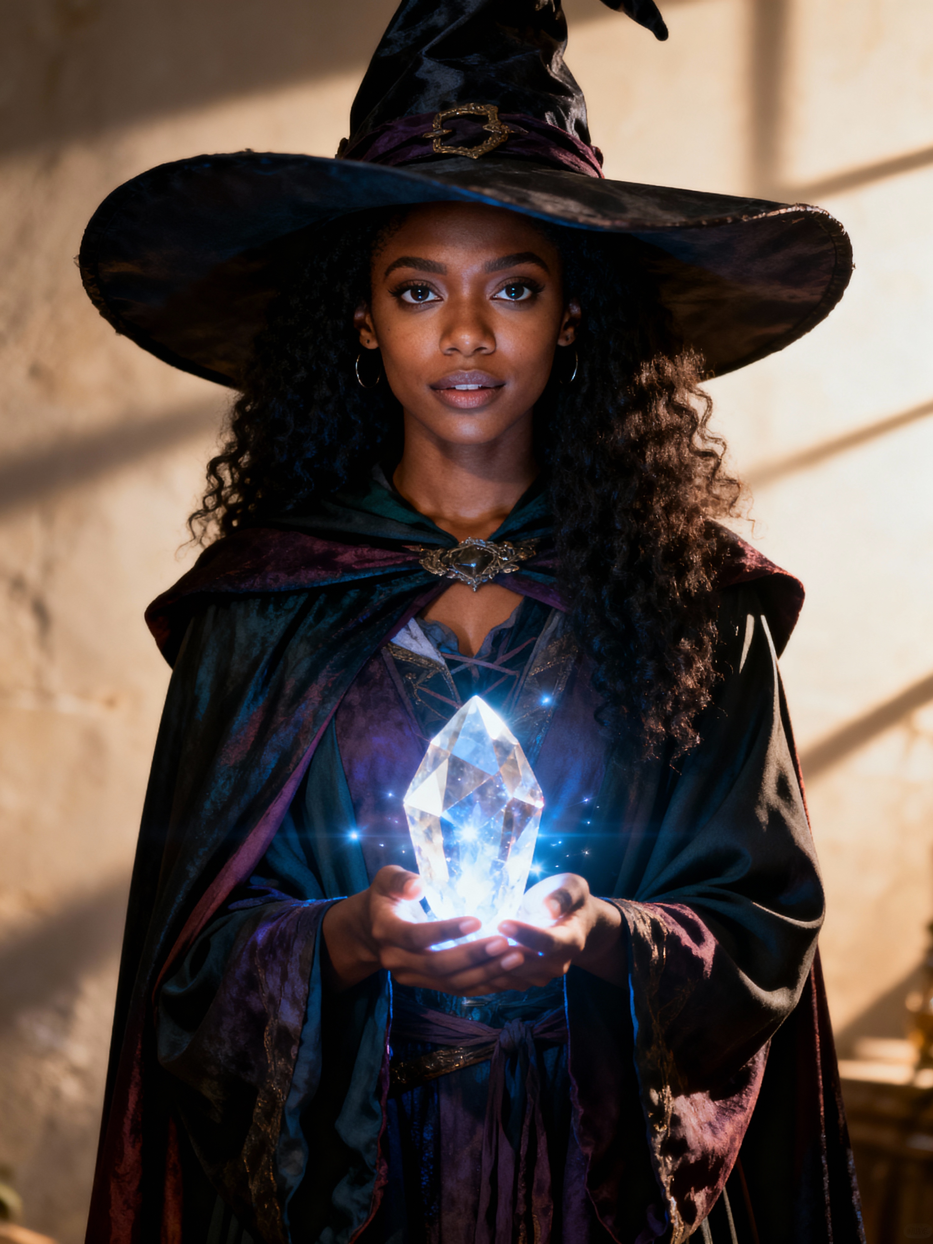 model as a Wizard with a Wizard robe and big hat, crystal magic, dramatic light