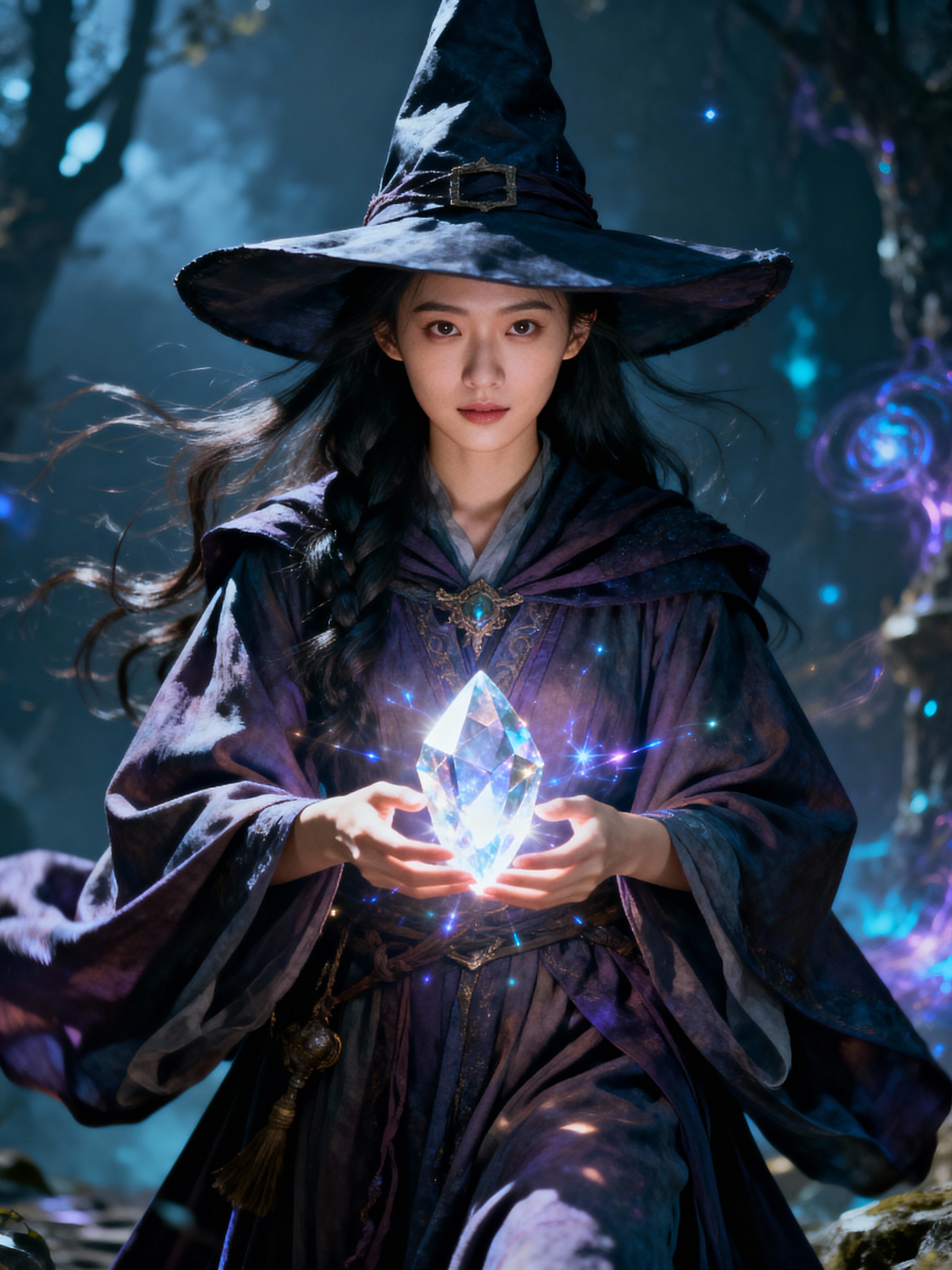 model as a Wizard with a Wizard robe and big hat, crystal magic, dramatic light