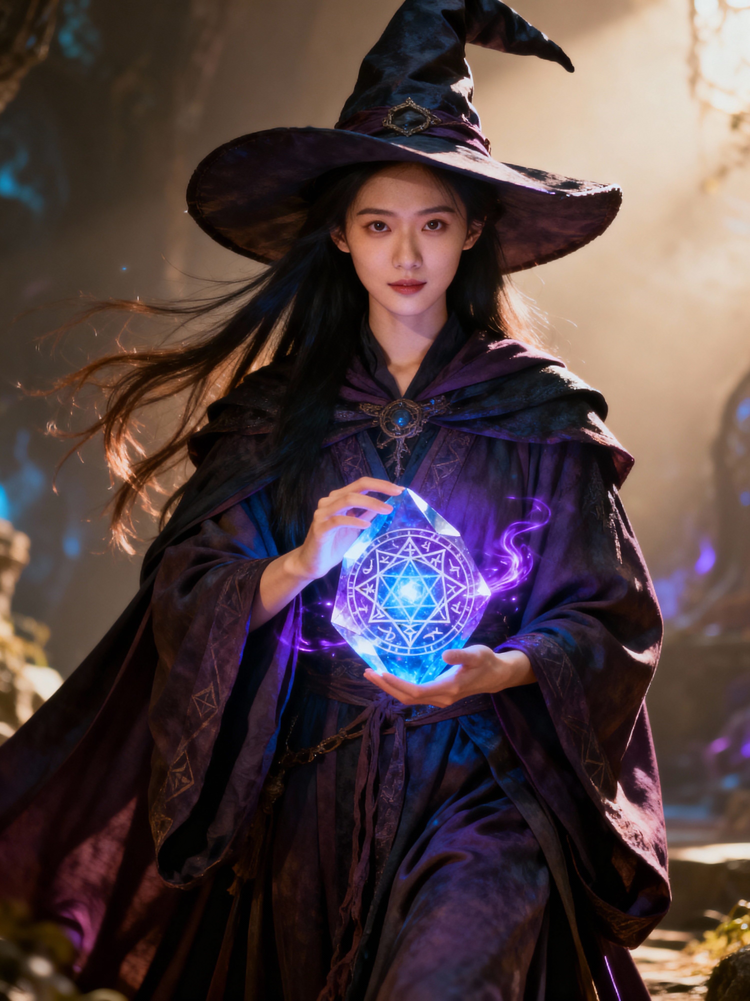 model as a Wizard with a Wizard robe and big hat, crystal magic, dramatic light