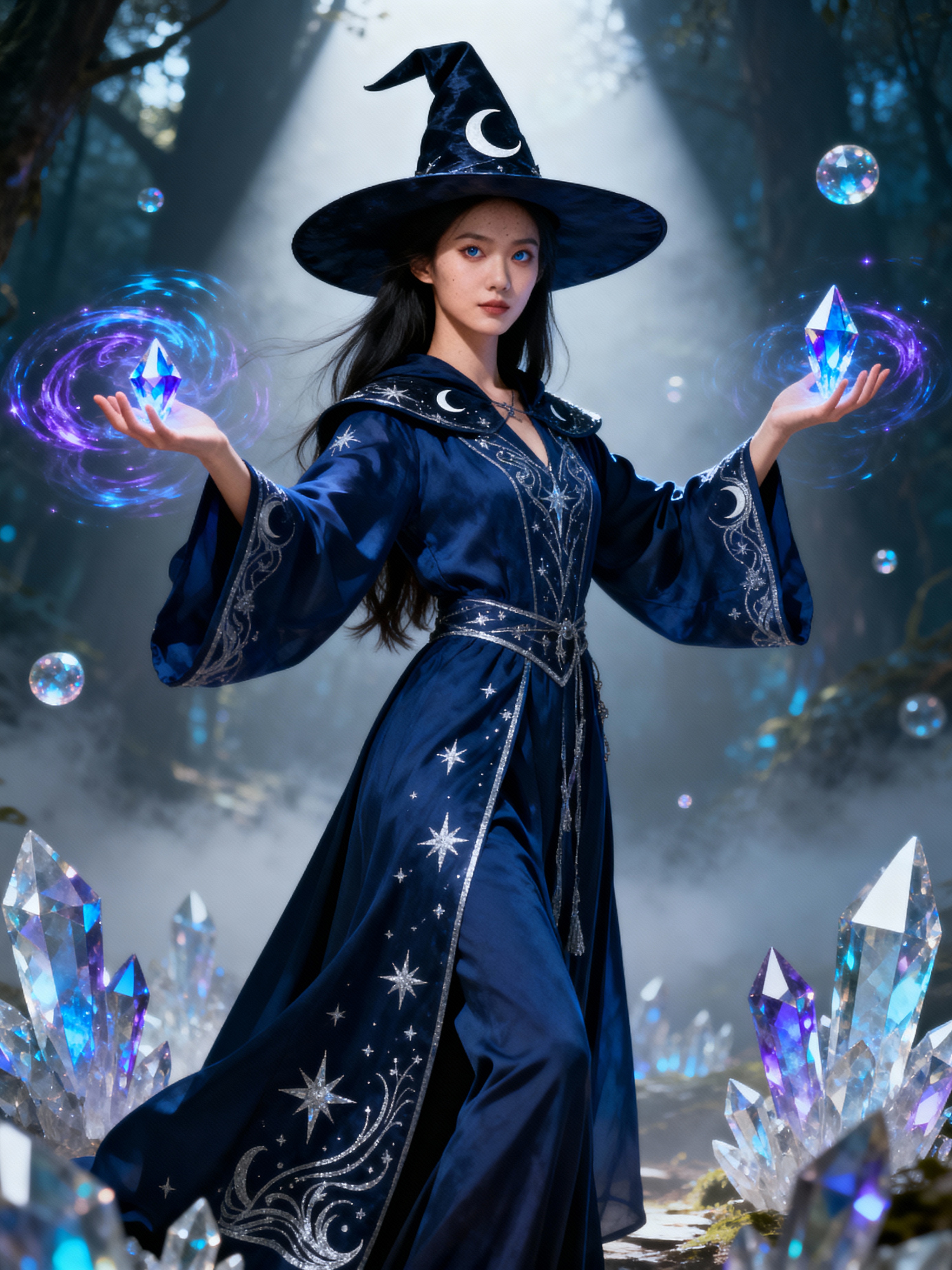 model as a Wizard with a Wizard robe and big hat, crystal magic, dramatic light