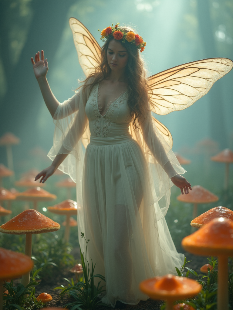 model as a woodland fairy with flower crown and gossamer wings dancing in a circle of mushrooms with soft fog and pastel lighting creating an otherworldly atmosphere