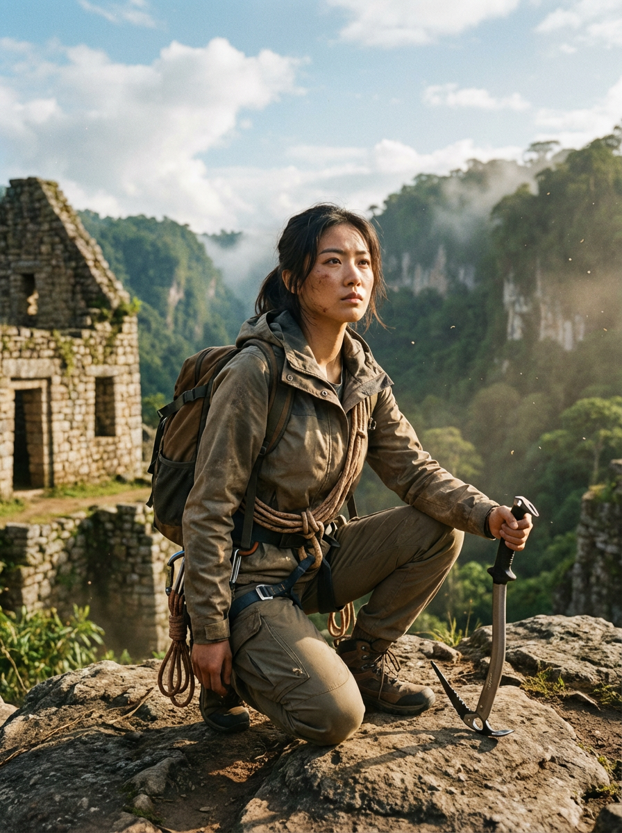 model as adventure book hero, action-ready pose, exotic location backdrop, exciting dynamic energy
