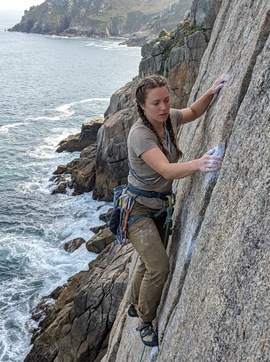model as adventurer rock climbing a daunting cliff with a breathtaking sea view