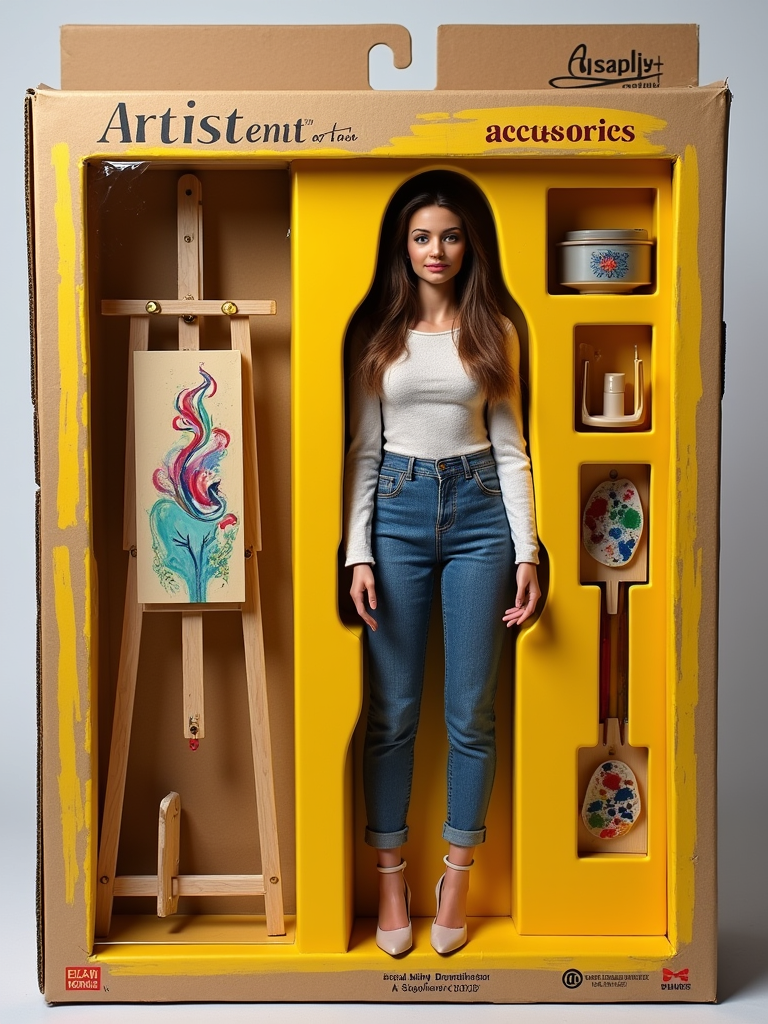 model as an action figure in packaging labeled 'ARTIST SERIES'. Use model as a reference for the face. Model is 6 inches tall and dressed in artistic attire, and holding a paintbrush. The cardboard section should be yellow. Include an 'Accessories' section with items like easel, paint palette, and art supplies. Make the design visually appealing and reflective of artistry. Do not include the character image on packaging.