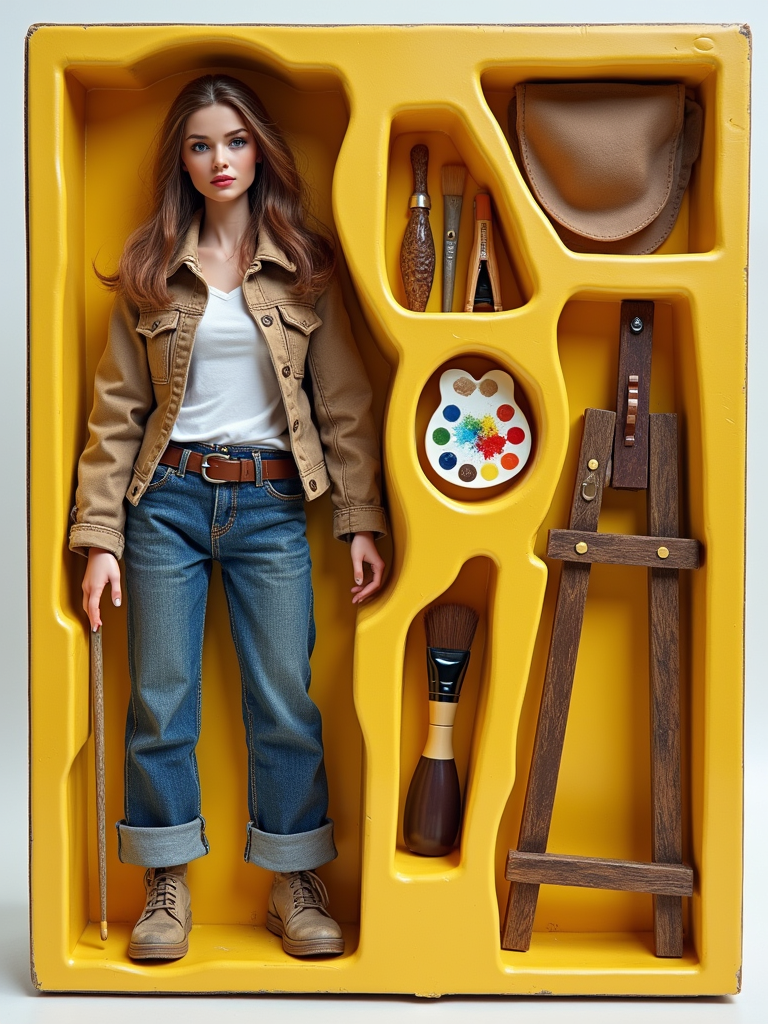 model as an action figure in packaging labeled 'ARTIST SERIES'. Use model as a reference for the face. Model is 6 inches tall and dressed in artistic attire, and holding a paintbrush. The cardboard section should be yellow. Include an 'Accessories' section with items like easel, paint palette, and art supplies. Make the design visually appealing and reflective of artistry. Do not include the character image on packaging.